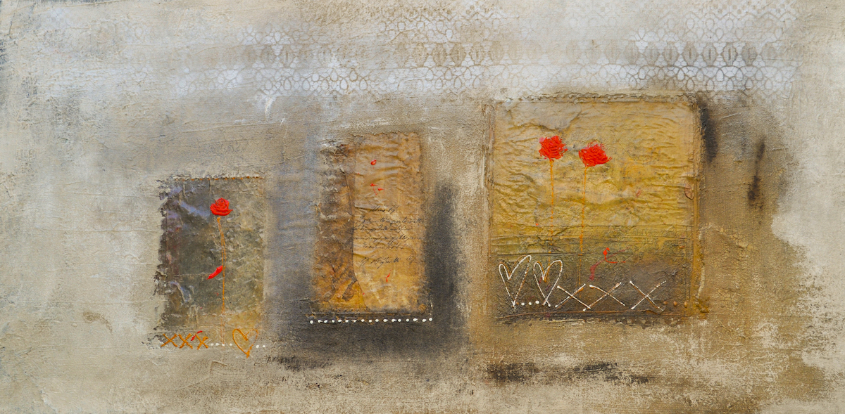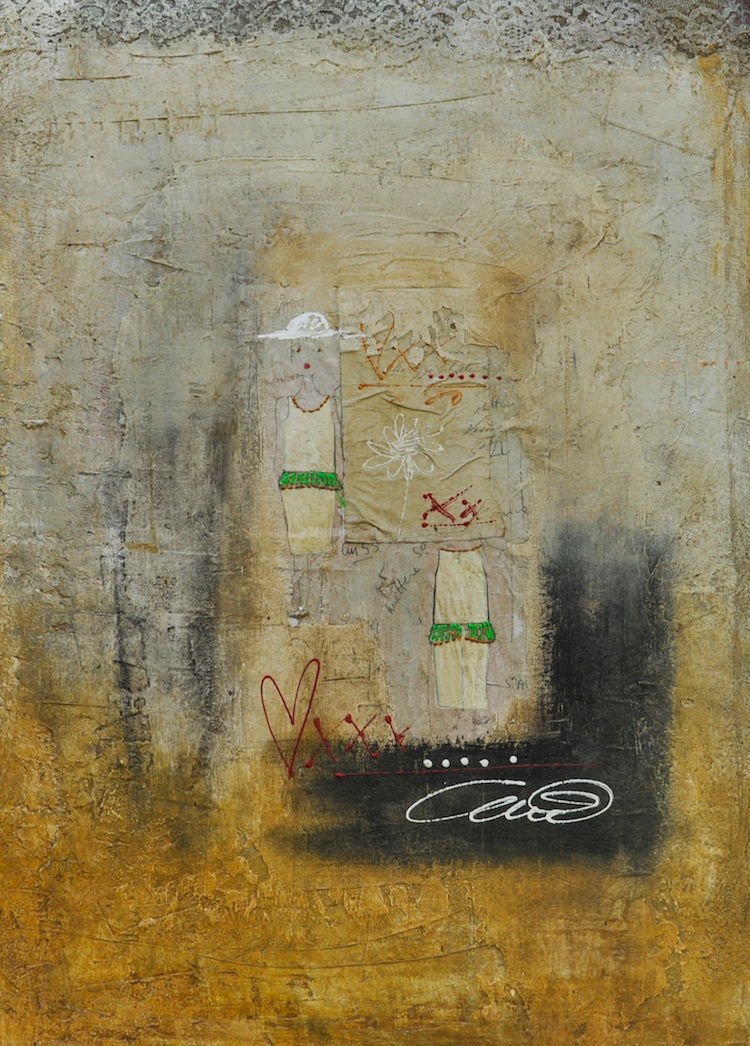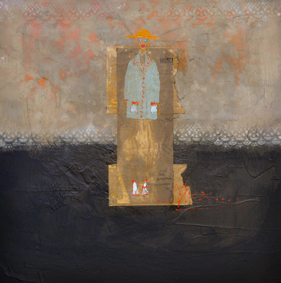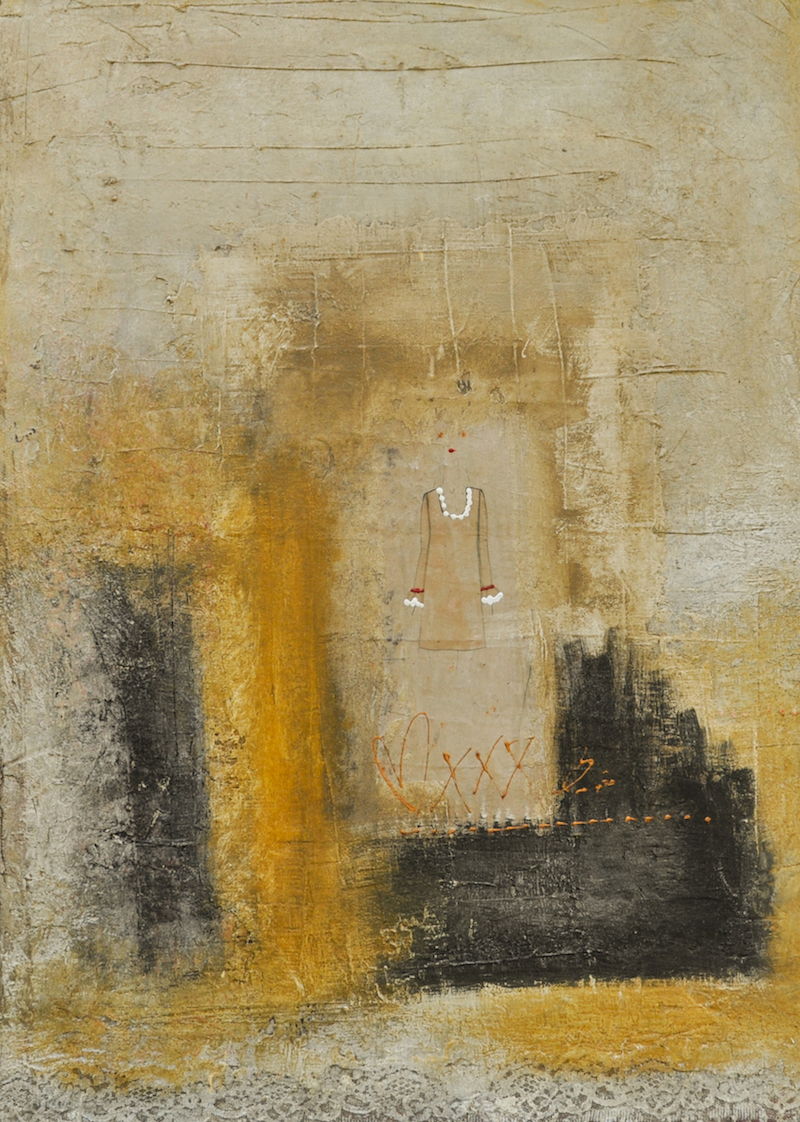 Sinuous and thin, sometimes almost sharp drippings thus cross the wrinkled surfaces of her paper and canvas, in an attempt to simultaneously define and freeze that creative process that at times brings the artist towards the creation of suspended iron landscapes: golden seascapes and Venetian cupolas, damp mountains and lands like the Zoran Music hills, or heaps of sand, almost dunes of dust against ochre or pink backgrounds similar to rock eroded by time or by water.