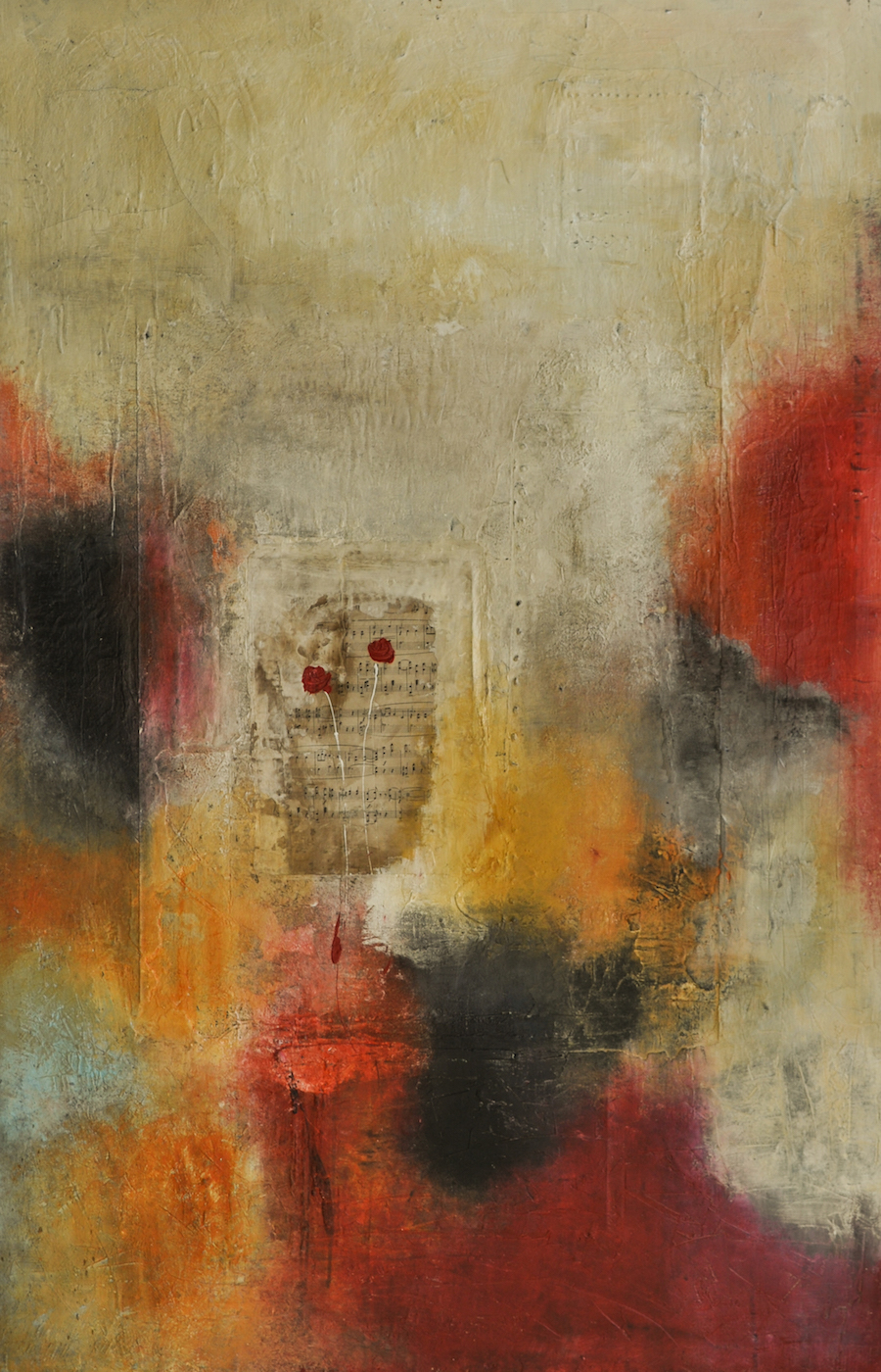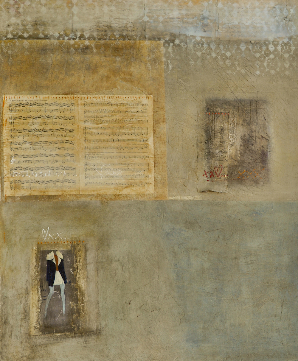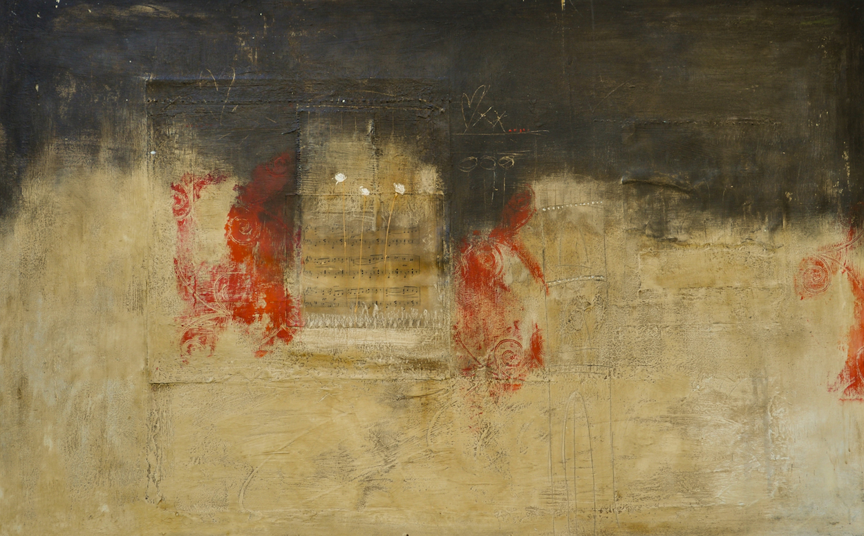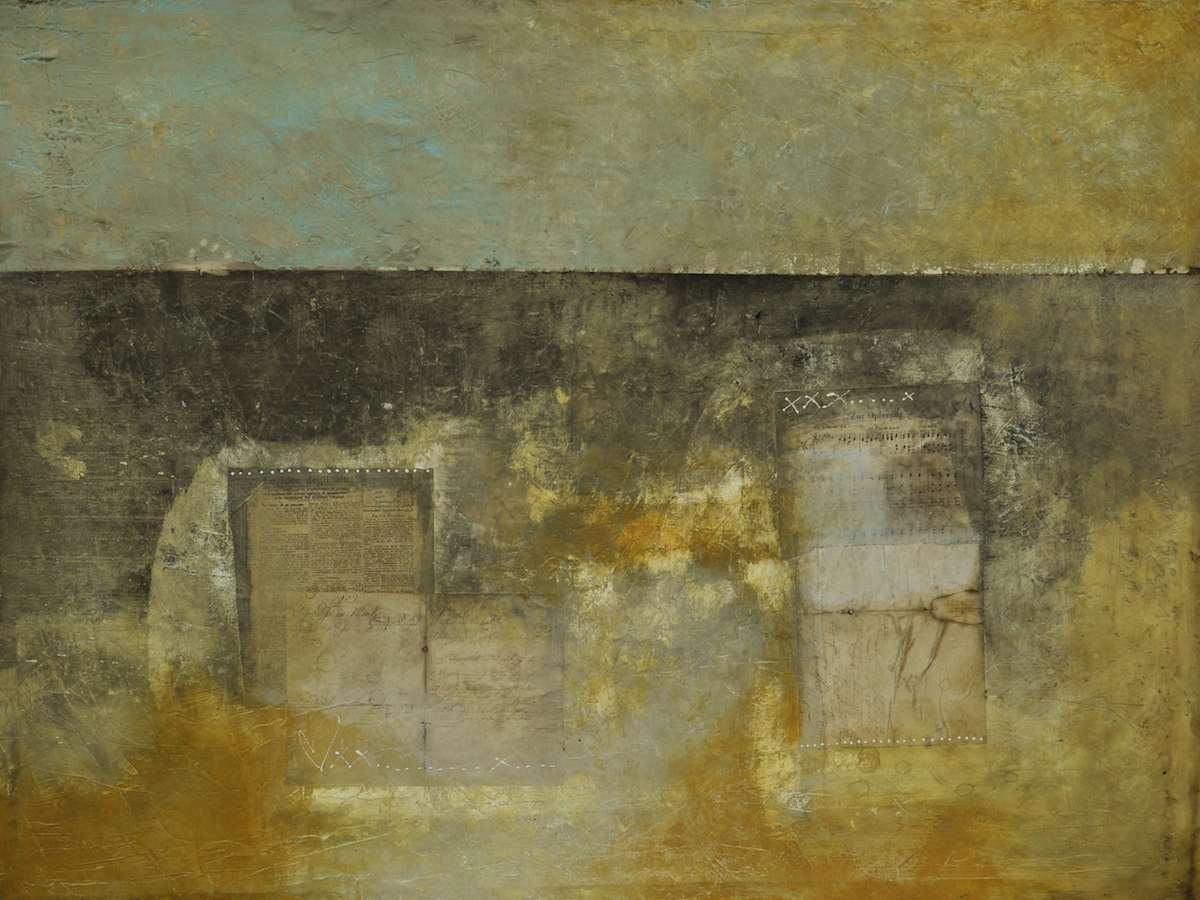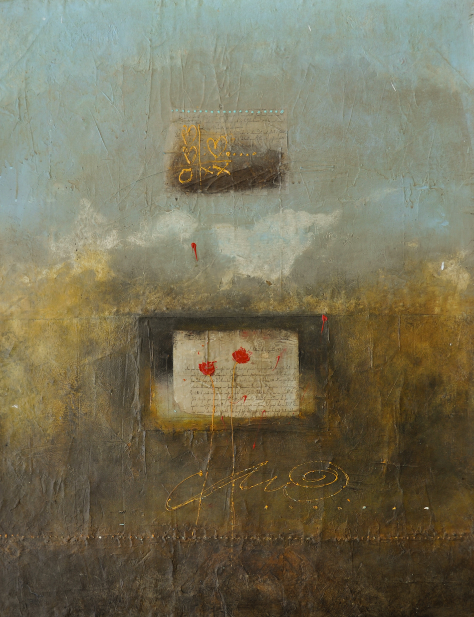 Thus from an unsettling golden magma or thunder clouds, memory emerges as pages from a diary or from a book of memoirs that the artist has found in an antiques dealer.