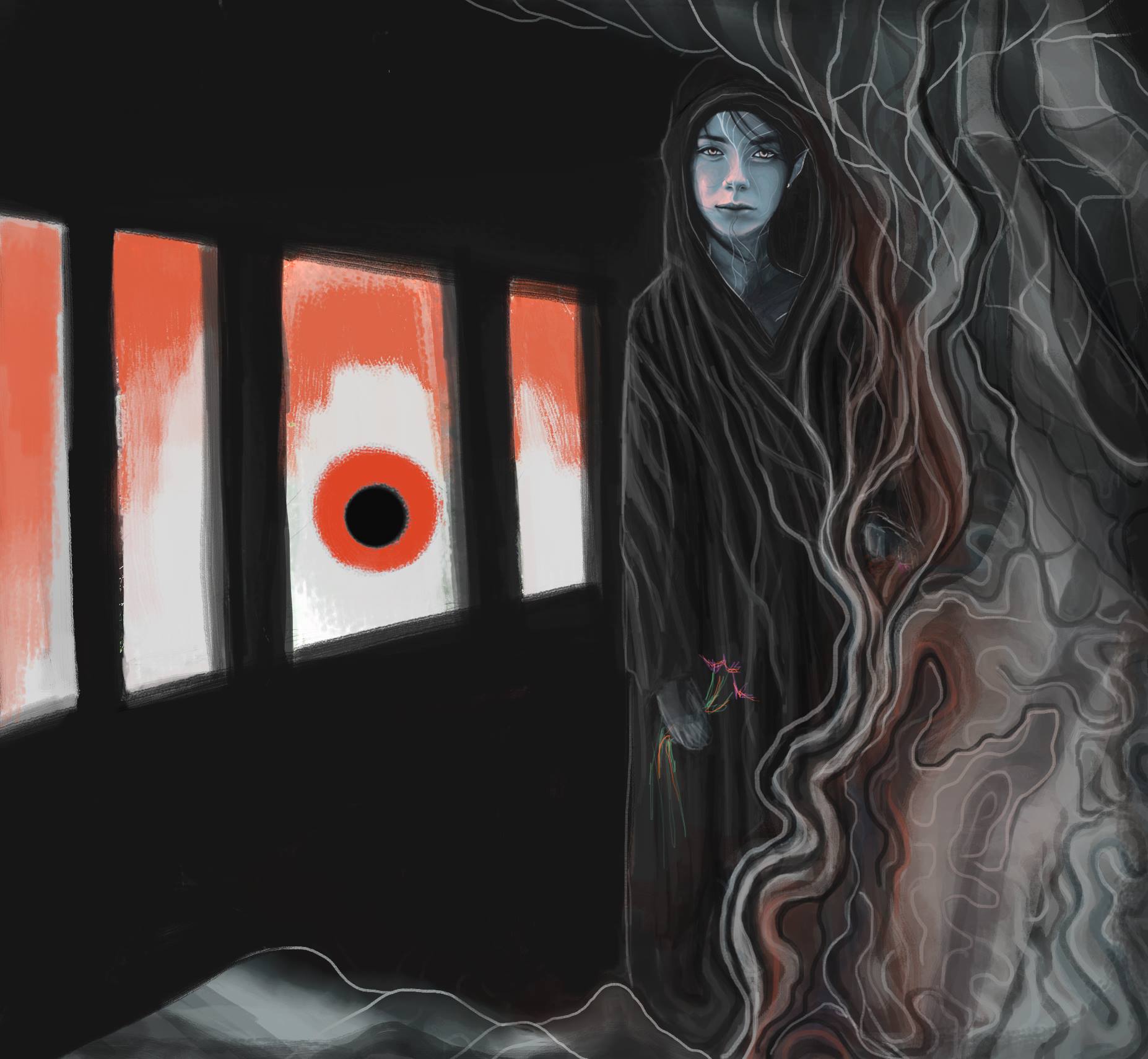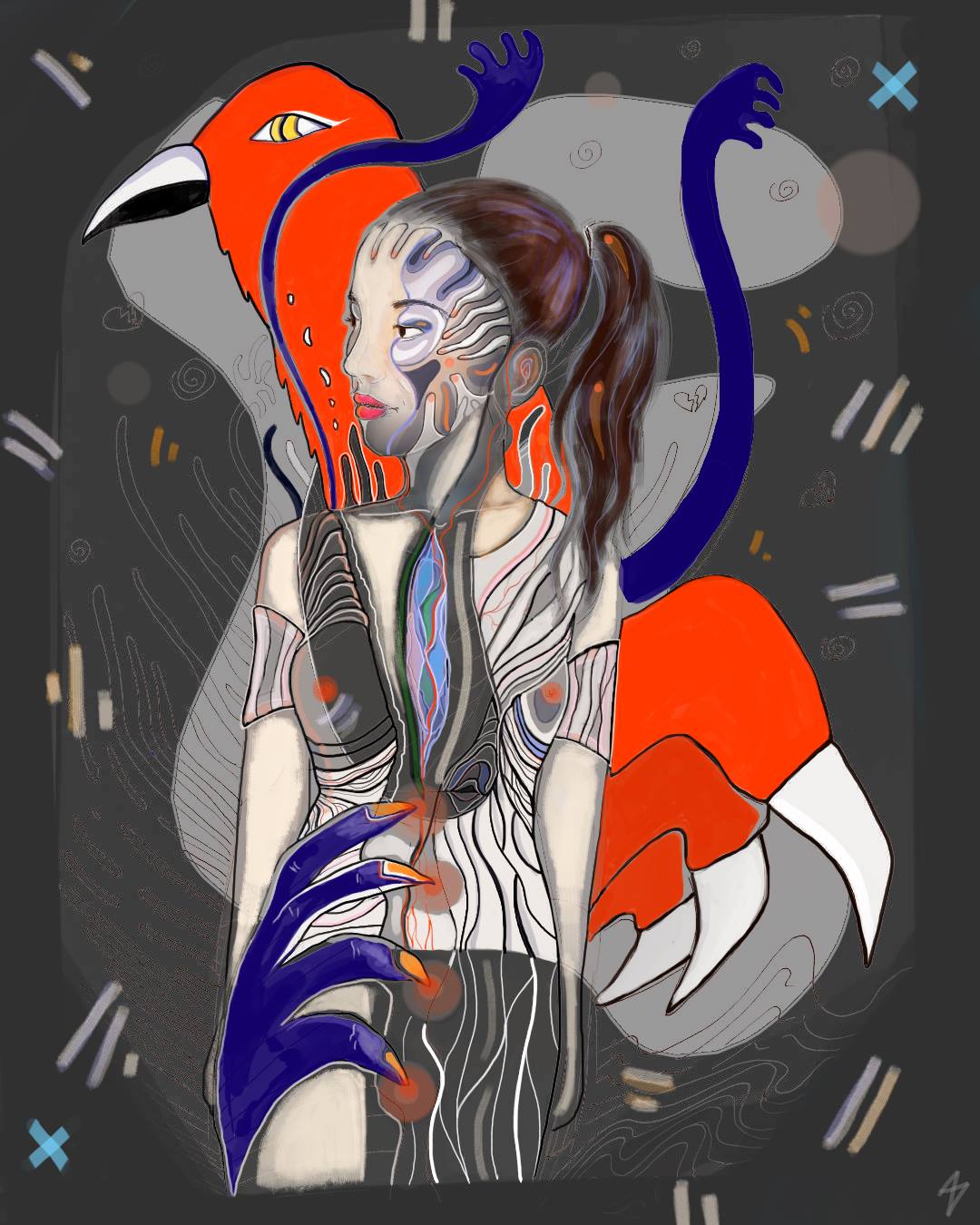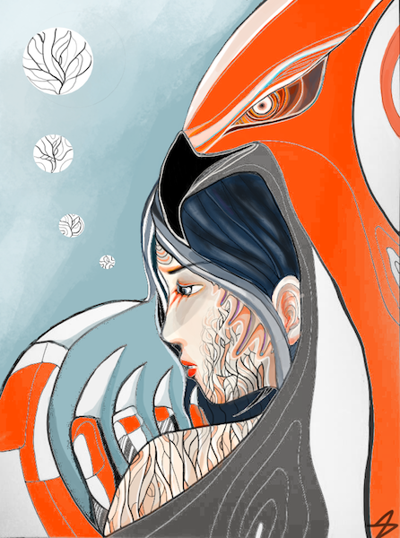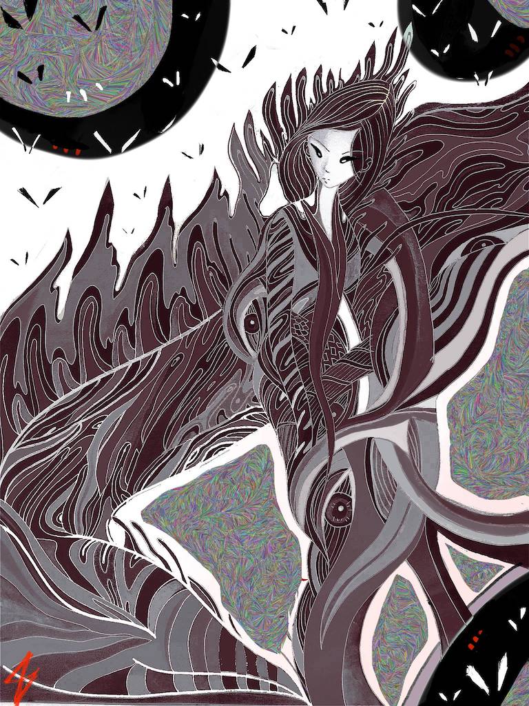 These particular artworks are very recent and, therefore, share similar visual, emotional and intellectual characteristics. In terms of style, I mix abstract and surrealist art with Japanese inspired line work. I enjoy working with bold colours and creating an uneasy atmosphere of claustrophobic movement. Emotionally, all my artworks are about an internal conflict in relating and coming to terms with one’s human condition and existential unease. There is a sense of alienation, fear and struggle to create beauty in the face of uncertainty. There is also a strong awareness of oneself as linked to environmental degradation caused by excessive urbanisation which is experienced in a personal way, as someone struggling with urban living. In Raven Clawed, for instance, the crow (or raven) is a symbol for pandemic lifeforms thriving on urban garbage and in turn diminishing the environmental diversity and richness of the landscape. There is also a yearning for beauty and natural freedom as in ‘Frozen World’, a silent, cold, clean utopia.