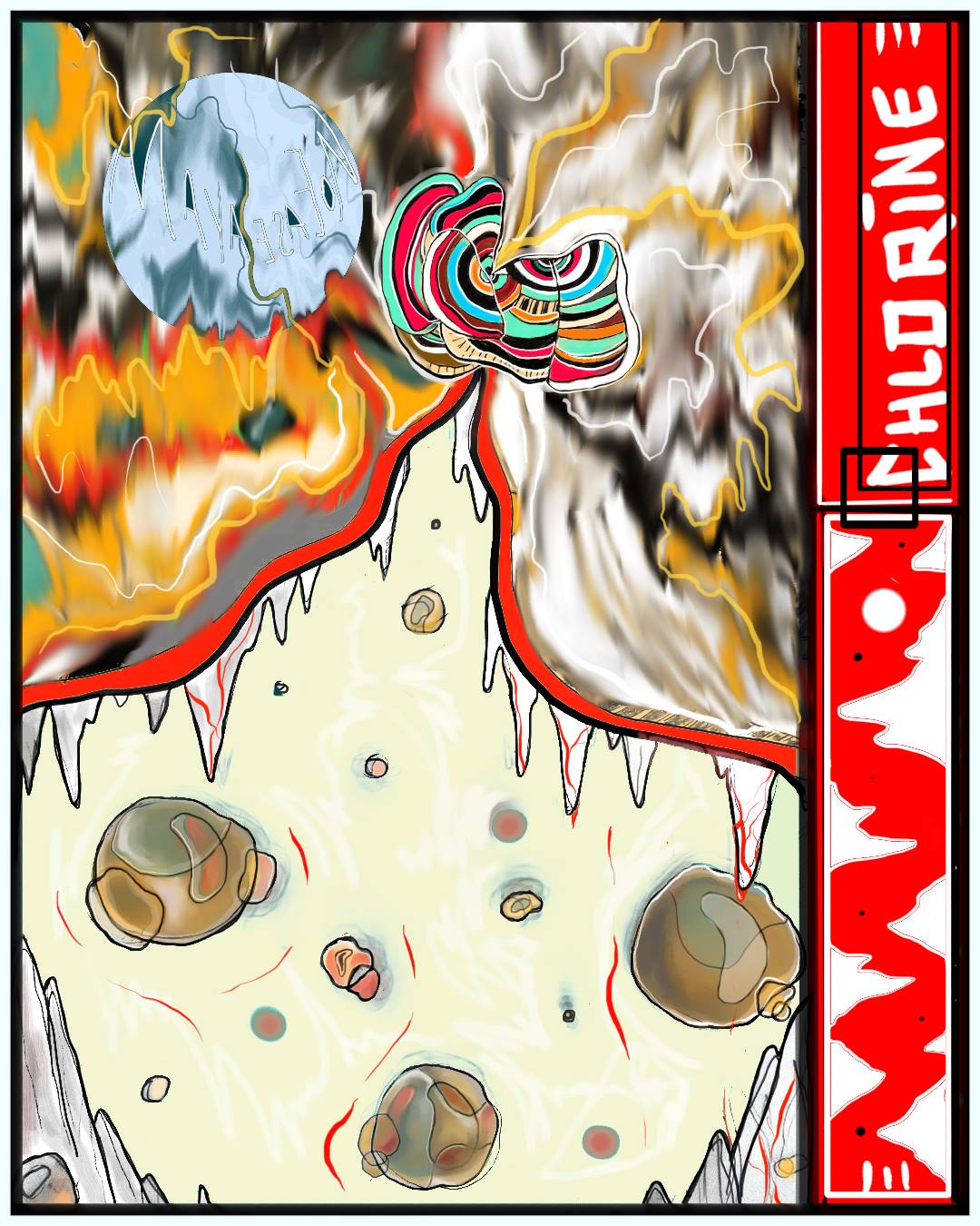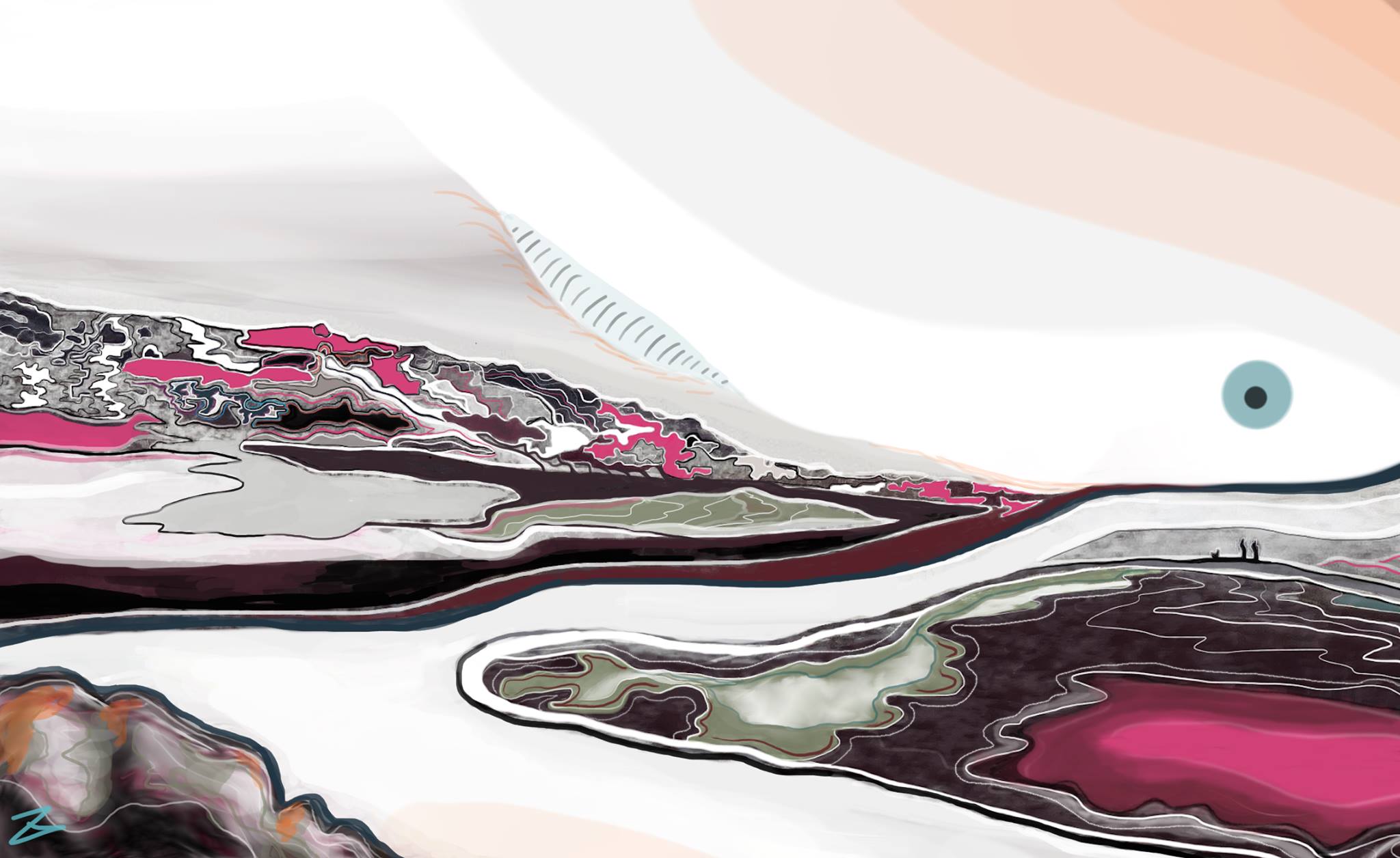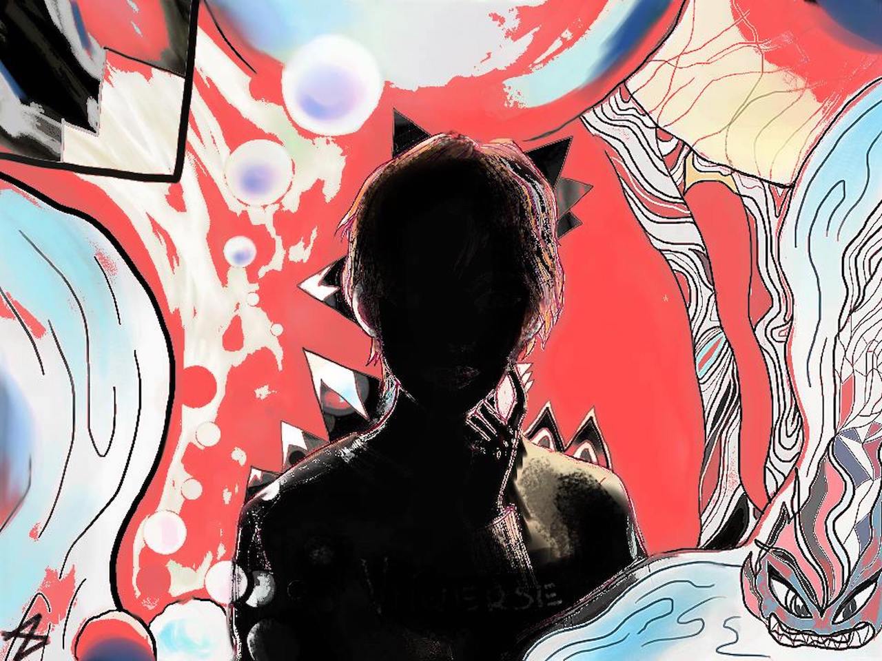 These particular artworks are very recent and, therefore, share similar visual, emotional and intellectual characteristics. In terms of style, I mix abstract and surrealist art with Japanese inspired line work. I enjoy working with bold colours and creating an uneasy atmosphere of claustrophobic movement. Emotionally, all my artworks are about an internal conflict in relating and coming to terms with one’s human condition and existential unease. There is a sense of alienation, fear and struggle to create beauty in the face of uncertainty. There is also a strong awareness of oneself as linked to environmental degradation caused by excessive urbanisation which is experienced in a personal way, as someone struggling with urban living. In Raven Clawed, for instance, the crow (or raven) is a symbol for pandemic lifeforms thriving on urban garbage and in turn diminishing the environmental diversity and richness of the landscape. There is also a yearning for beauty and natural freedom as in ‘Frozen World’, a silent, cold, clean utopia.