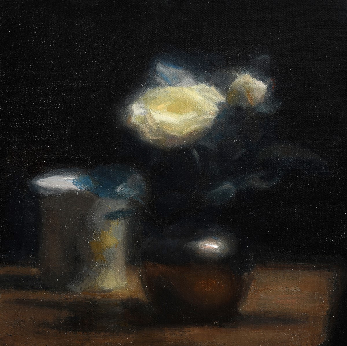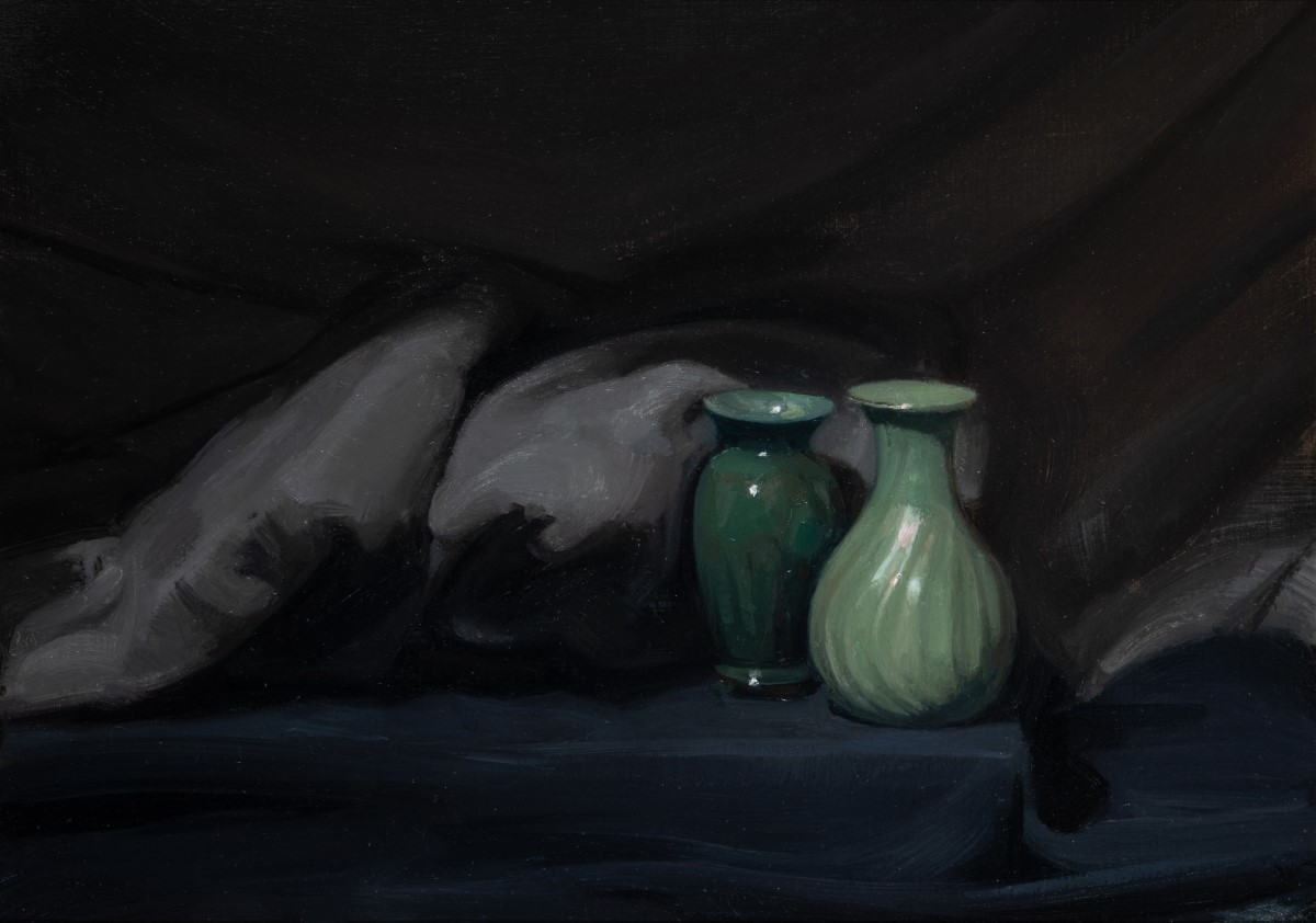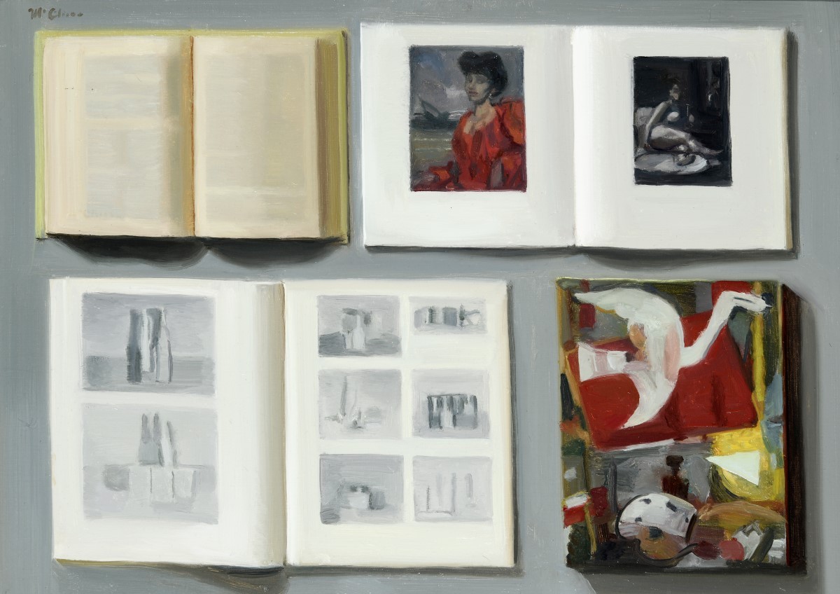 His turn towards landscapes, however, has done little to overtake his natural eye for still life. When within the studio, his energy is focused on informal arrangements, capturing the effect of light and shadow, with complex compositions viewed through angled mirrors that play with ideas of depth and illusion. These works allow McClure to experiment, playfully and intellectually, and offer a foil in mood and subject to his outdoor painting.