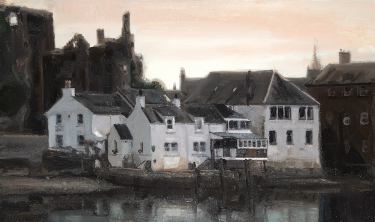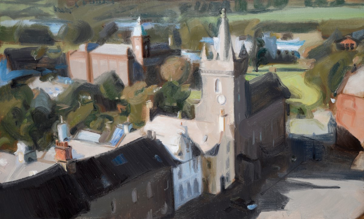 Although he has lived amongst the town’s cottages since 2018, it is only recently that McClure has turned his artistic attention towards his surroundings. His viewpoint is often unconventional, with paintings highlighting the industrial nature of the working harbour or drone’s eye views from the town’s famous Tolbooth. Pursuing Oppenheimer’s journey up the Old Courthouse Tower’s stone stairs, McClure finds himself lost in the coexistence of the town’s timeless appeal and its snaking lines of cars, reflecting an unavoidable feature of our era. These landscapes reveal the personal interpretations of his lived experiences, introducing a new chapter in Kirkcudbright’s artistic history.