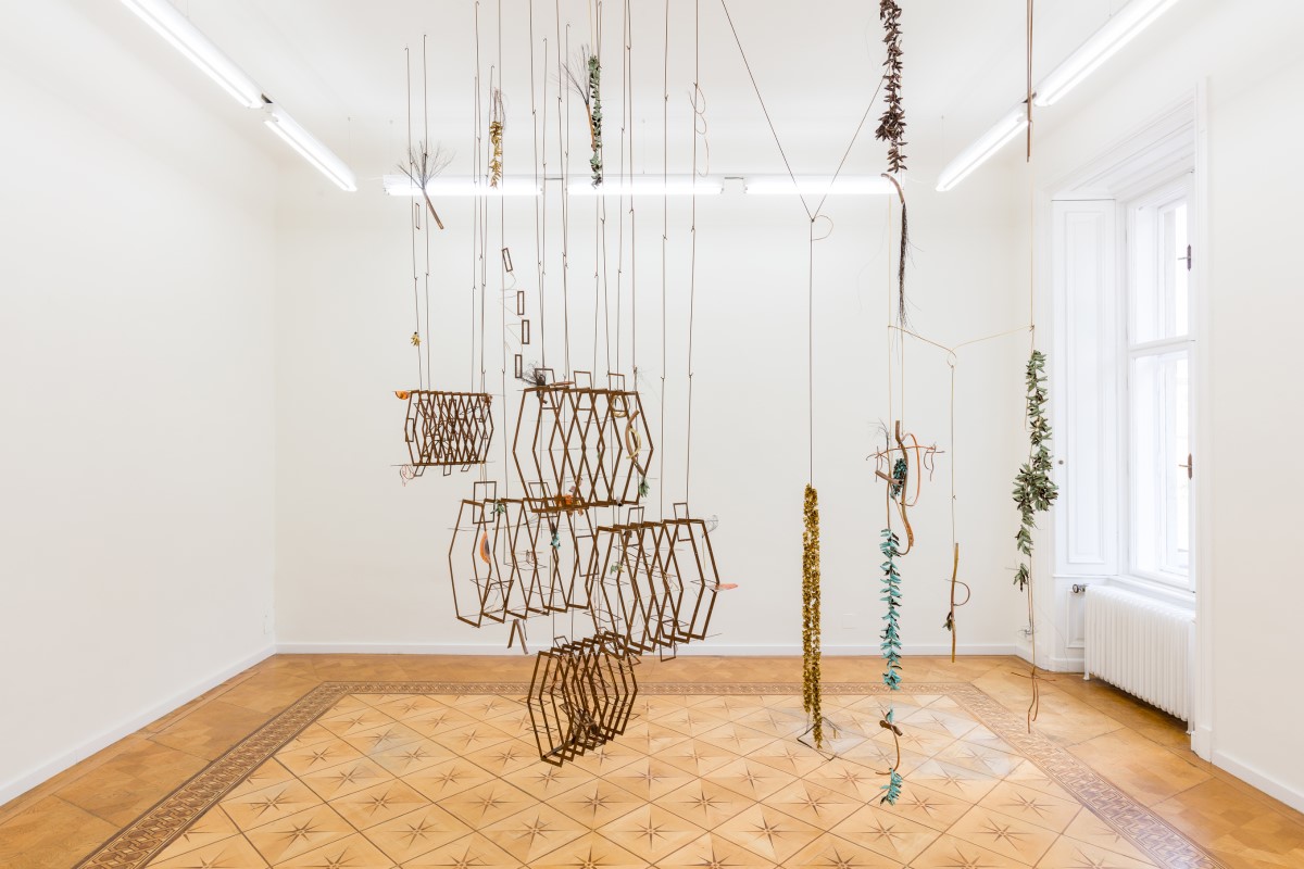 Working from her home – a farm in the small village of Koplany in Eastern Poland, artist Iza Tarasewicz (B.1981) utilizes raw materials and rural systems of production to create complex spatial installations. Her works often take the form of modular, flexible, mobile, and reconfigurable display systems that combine a raw and modest functionalism with formal logics found in the natural world, scientific experimentation, graphs and diagrams. Creating clusters of sculptures that resemble three-dimensional drawings or in her words ‘diagrams of possible architectures’ she uses both organic and inorganic materials to map relationships between cellular, social, agricultural, and celestial interactions.