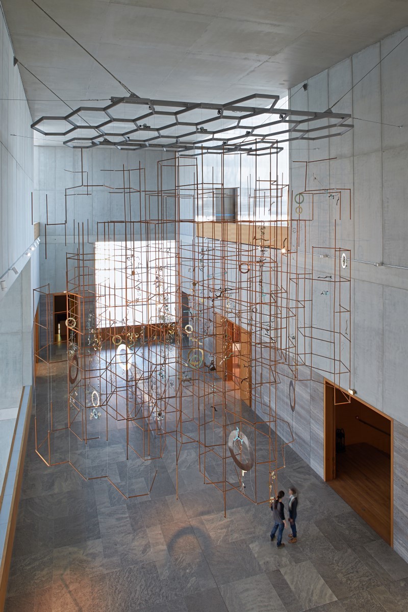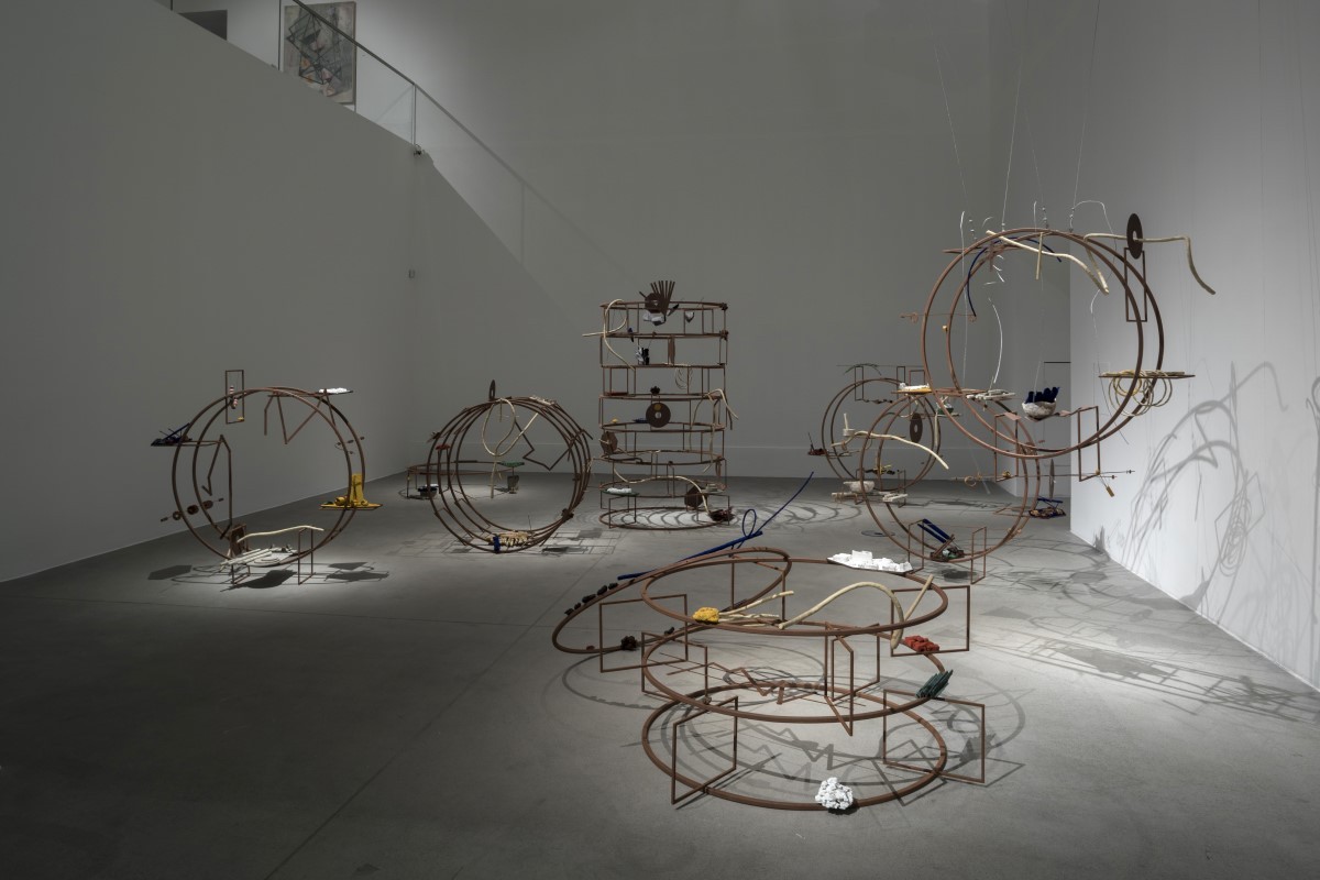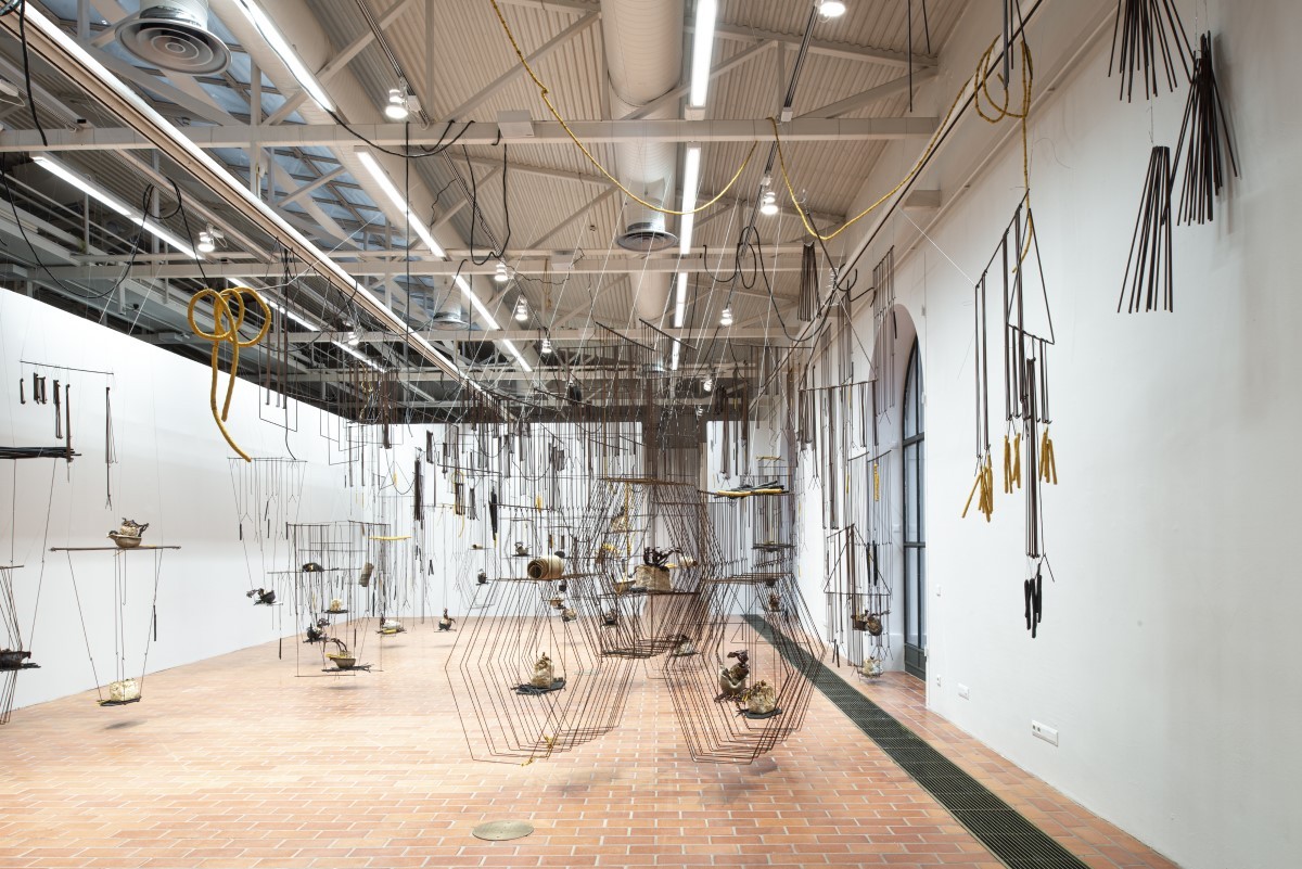 A key component of the exhibition is a series of hanging assemblages inspired by Mazurka’s circular and repetitive rhythms. Made of dense forests of delicate metal rods, suspended sculptures generate an abstracted choreography, framing the larger works and the rest of the exhibition. These sculpturally gestural structures also collate and display a library of raw materials such as plant fibres, iron oxide and clay. Tarasewicz interprets this matter as embedded information, layers of meaning which are metabolized and organized within a productive system.