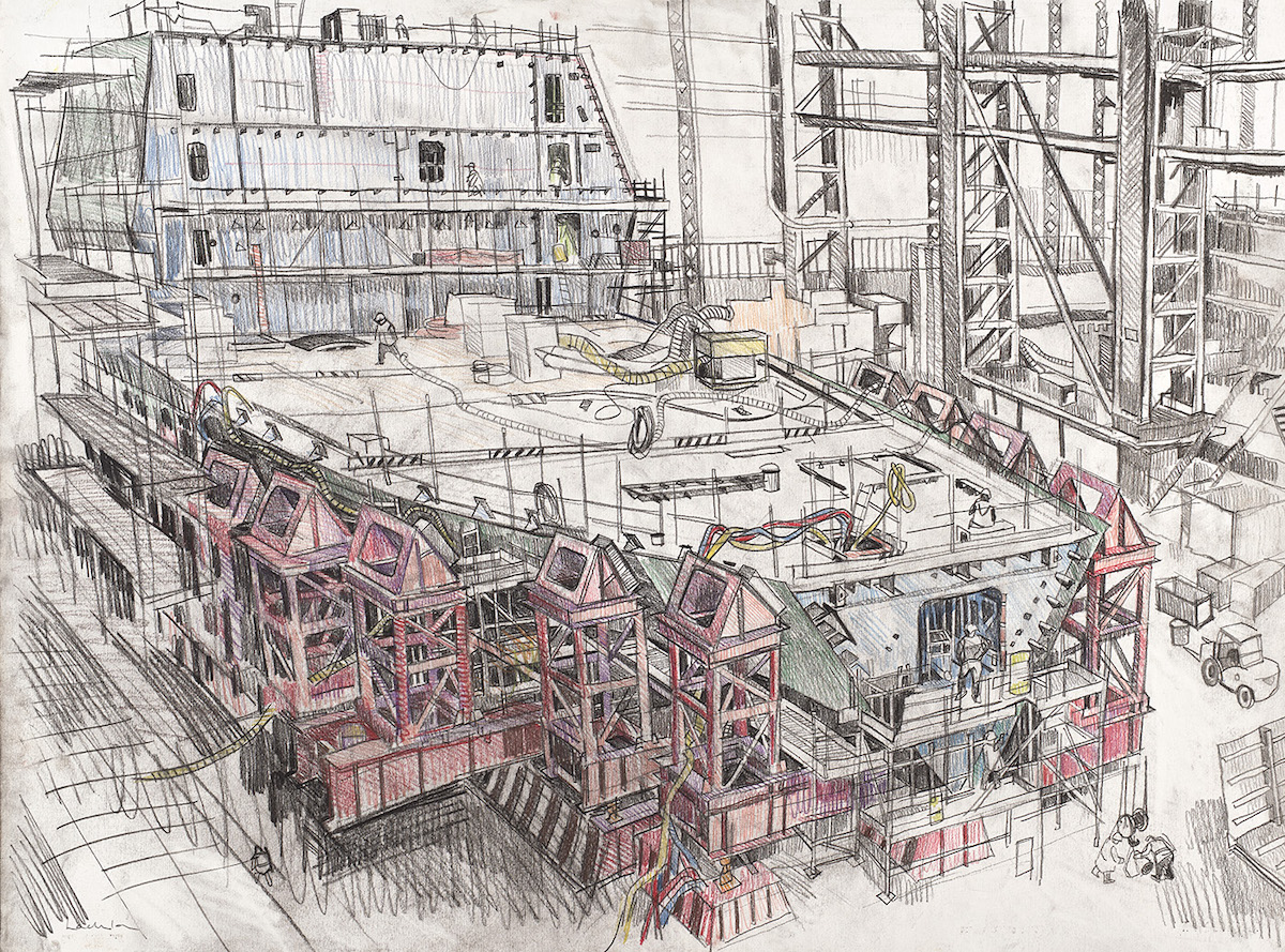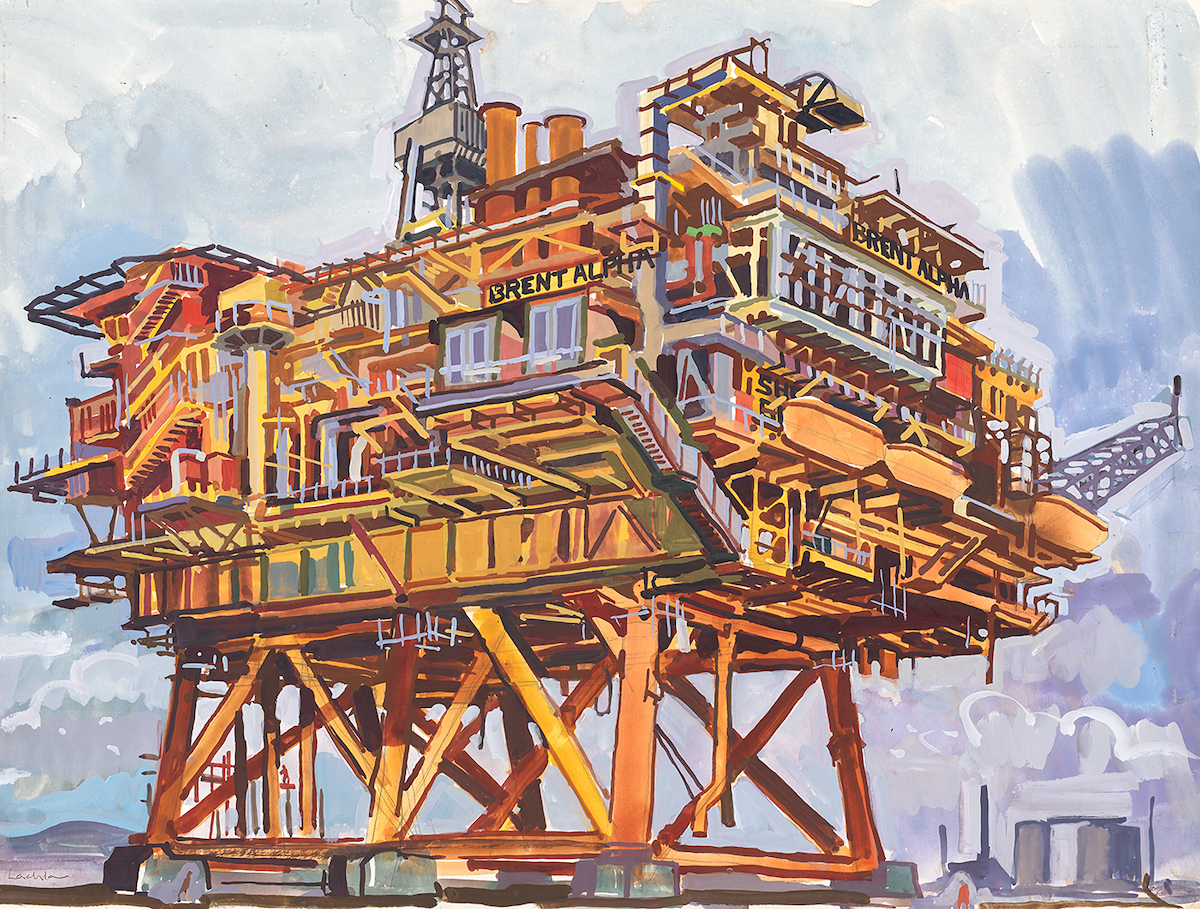 In many cases, Goudie’s work has borne witness to the end of an industrial legacy and the environmental impact this represents. His paintings document the last days of steel production at Port Talbot and Redcar, the changing skyline of Glasgow as ‘Titan’ cranes were demolished and replaced, whilst on the northeast coast at Hartlepool, he has charted the dismantling of immense offshore rigs, monumental structures that once defined the North Sea Oil boom. On other occasions he has been able to record the resilience of steel rolling at Dalzell (the last surviving component of the immense Ravenscraig steel works) and the advance of innovative new technologies, at the Airbus space and satellite manufacturing labs in Portsmouth and Stevenage.