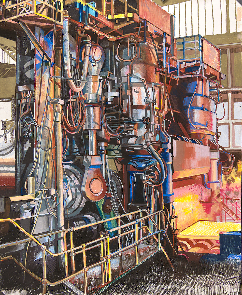 Over the course of more than a decade I have made a painting pilgrimage to, amongst other places, the UK’s deepest mine in Yorkshire, one of the world’s largest slate quarries at Dinorwig in Wales, the country’s most important oil refinery and a steel furnace the size of St. Paul’s Cathedral.