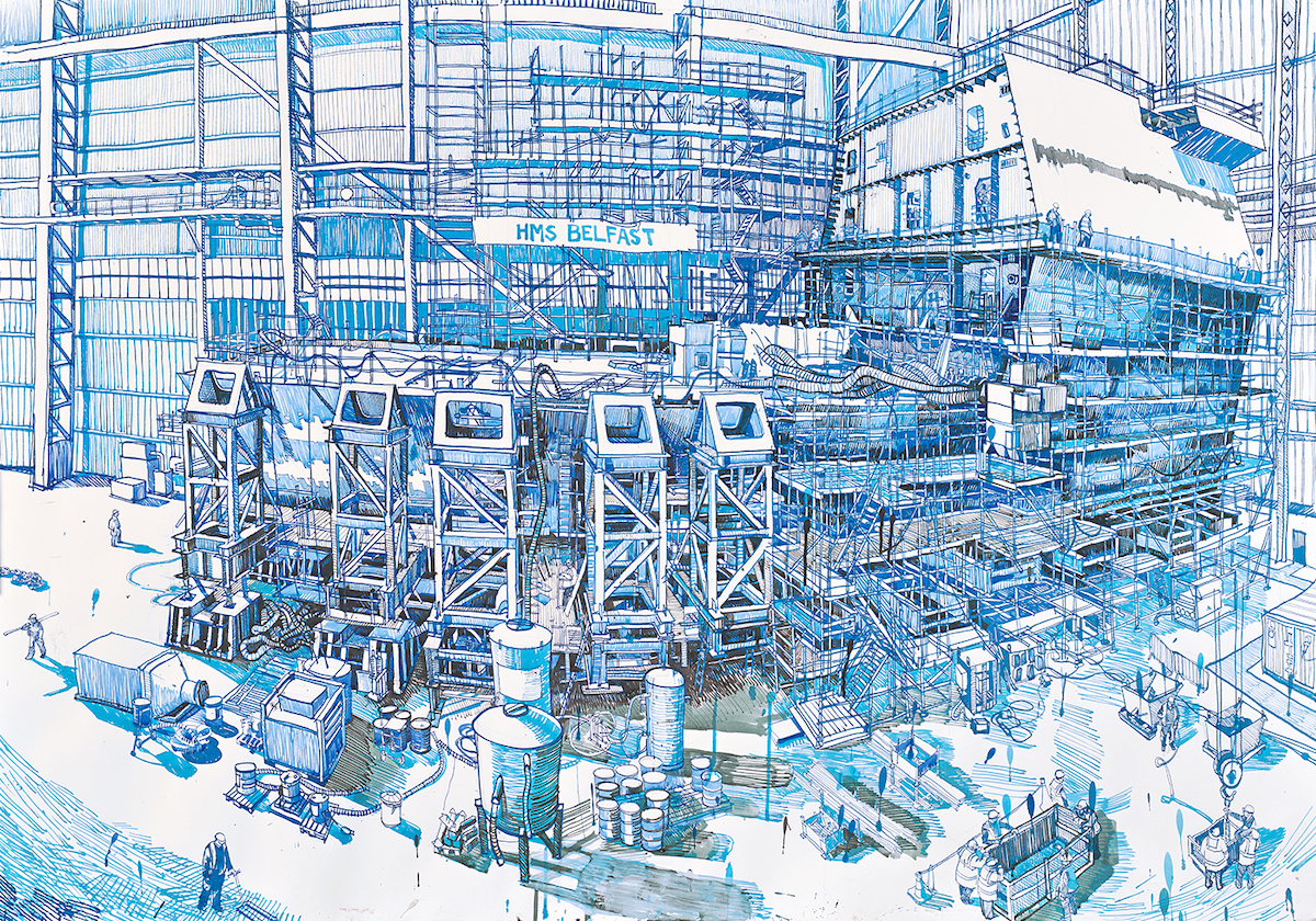 In time I managed to gain access to the BAE shipyards in Govan and Scotstoun, the last two major yards surviving on the Clyde and my first visits coincided with a resurgence of shipbuilding activity. I was the only artist permitted on site to document the construction of Britain’s vast naval flagships, the Queen Elizabeth Class aircraft carriers, and the craftsmen and women involved in that project.