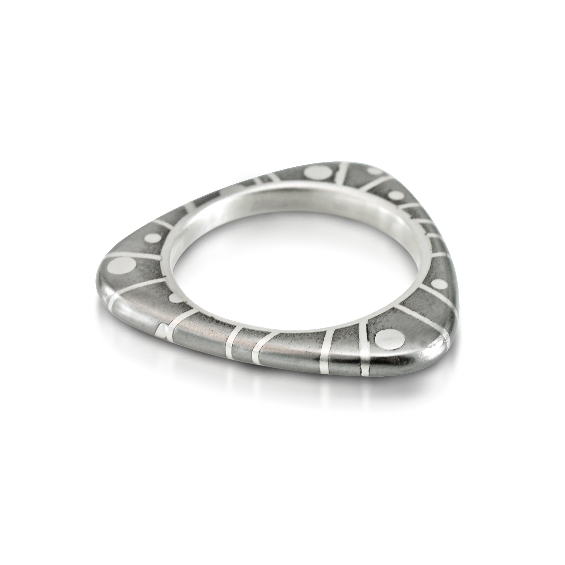 She uses sterling silver and 18ct (white, yellow and red) gold, which she often combines with semi-precious and precious stones to add colour and contrast. Her inspiration is mainly found in nature’s patterns, shapes, forms, textures and colours.