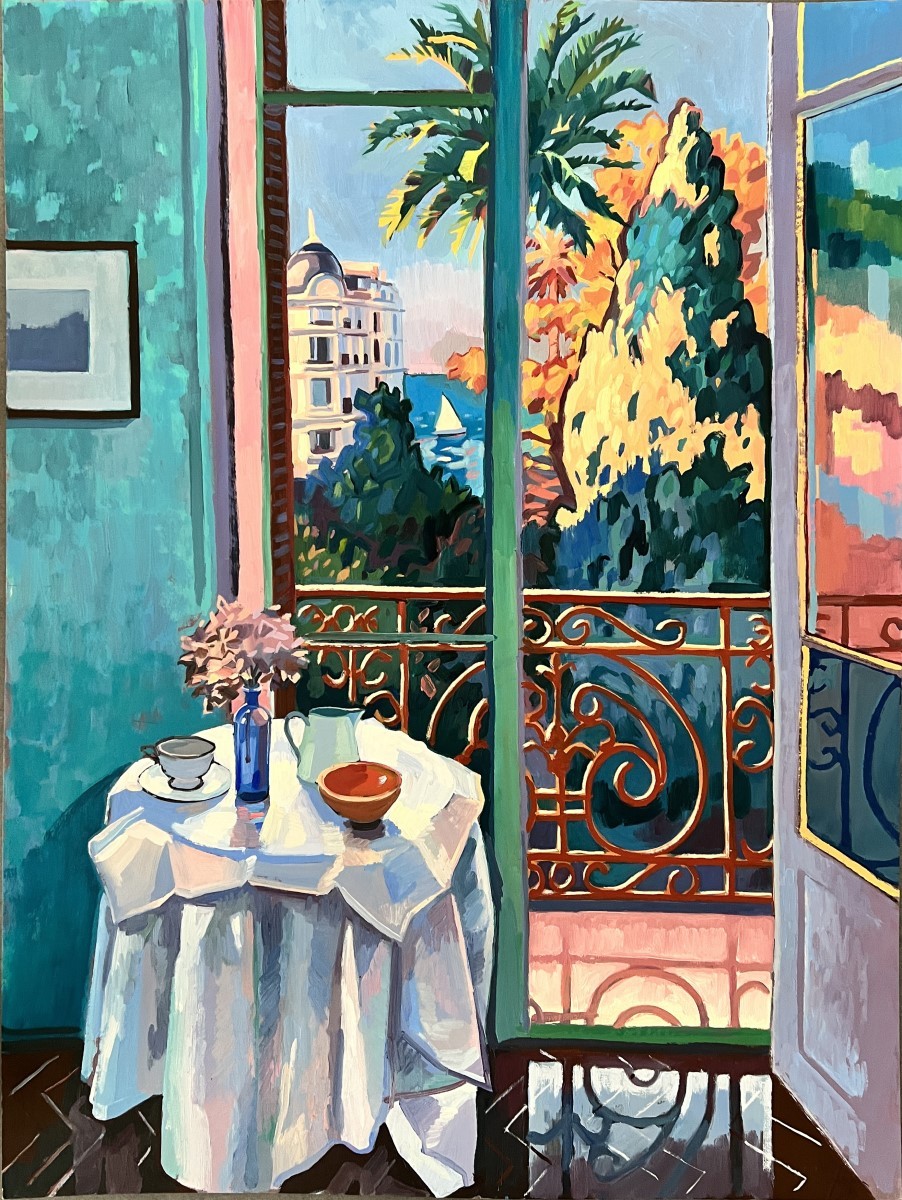 Goudie’s chief studio occupation, follow. From the city and studio, the exhibition then journeys to the Highlands and Western Isles; a commission in Inverness-shire gave Goudie the chance to work deep in ancient woodlands and capture the autumn colours of rolling countryside, and in Barra he captured the fresh, Atlantic atmosphere. The exhibition continues with work made in the South of France in Autumn 2021 where views through open-shuttered windows and down to the Cote d’Azur capture the high colour and heat of the sun. Finally, he captures the palm trees, distant mountains and towering skies over the Indian Ocean of Mauritius.