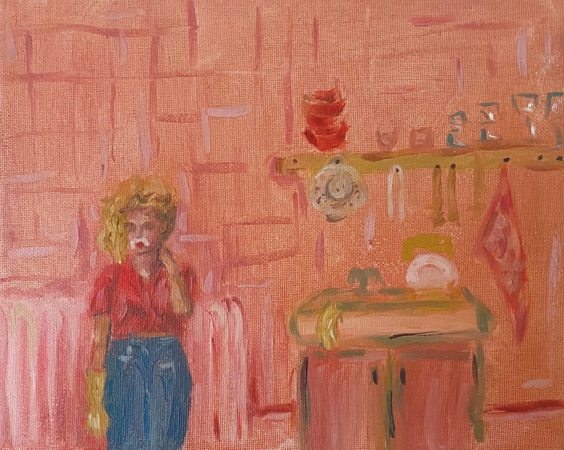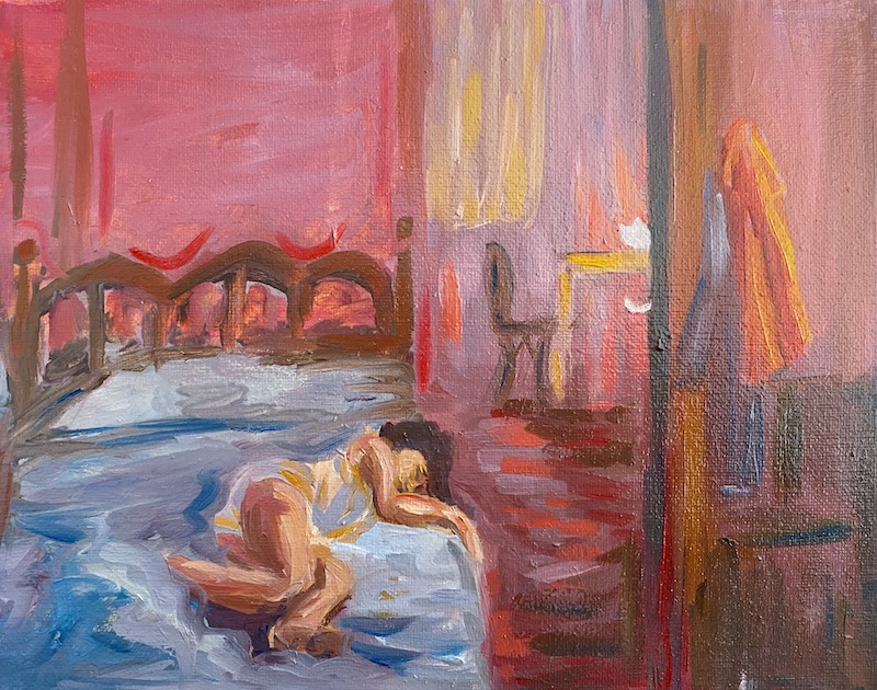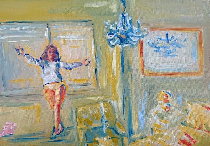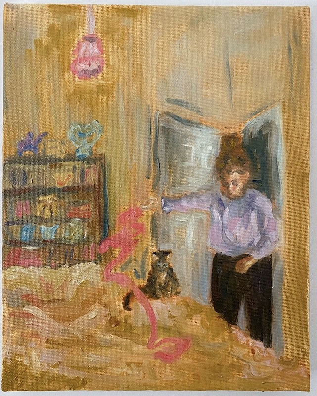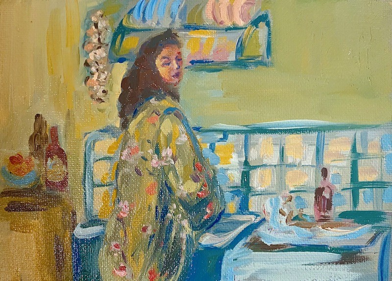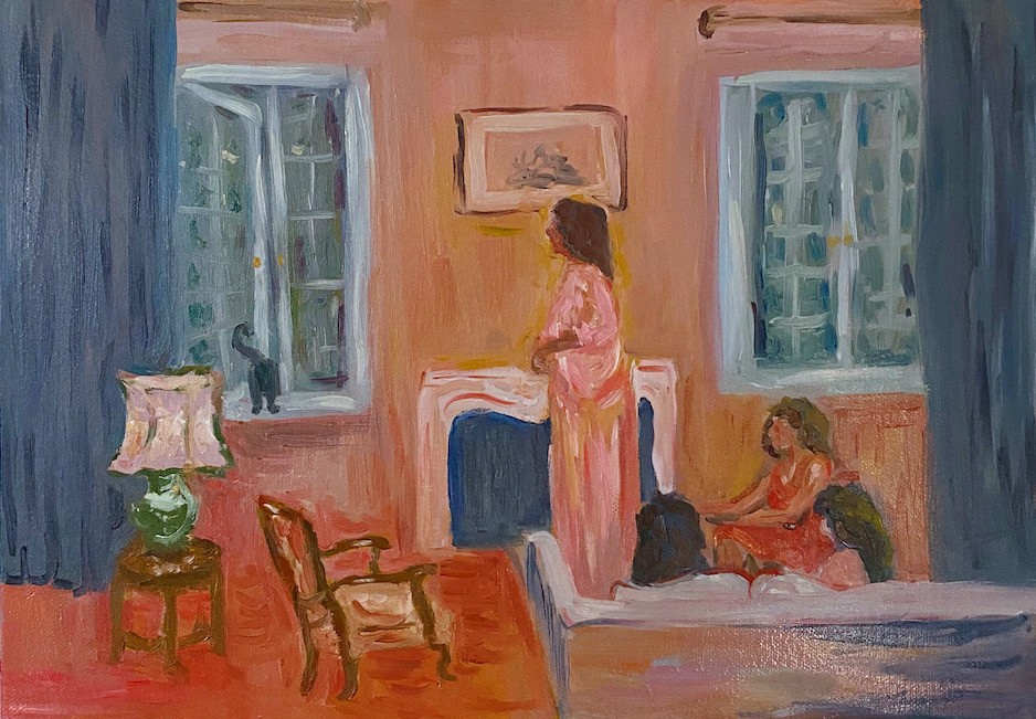 My paintings can be read overall as a love letter to women – the women I have grown up with, the women artists I have admired, and the female relationships that have been intrinsic to my own emotional growth. As a female artist, I aim to create a painted space that is devoid of a male gaze, and instead offers a space for both my female subjects and the viewers to breathe. In a time where our relationship with our immediate surroundings has become increasingly stressed due to the pandemic, my work tells a story of female resilience. I take inspiration from the women around me, those from film, television, books, and my imagination. My ambiguous painting style allows my characters to blur into their environment and opens a narrative for viewers to find their own story within my snapshots.