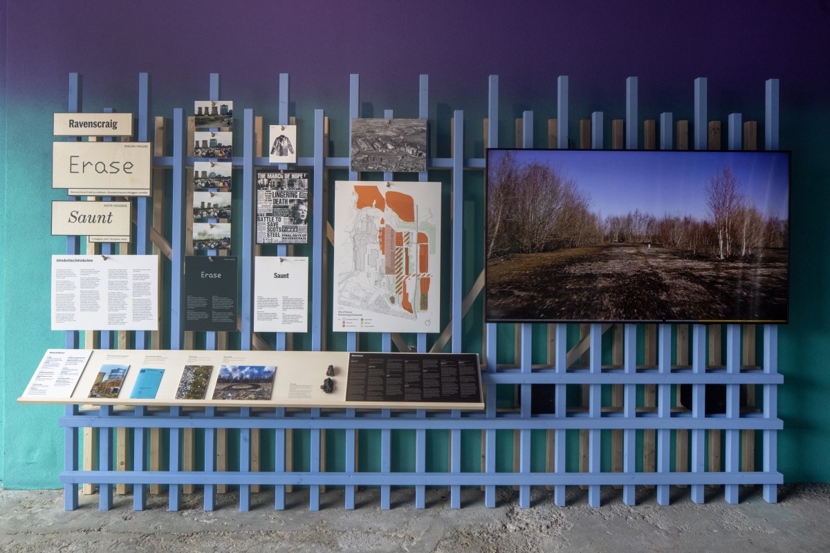 Situated adjacent to the dock with open views to the canal and city beyond, the exhibition is arranged into four distinct areas with visitors being gently guided through the landscapes of Loch Ness, Orkney, and Ravenscraig before reaching the reading room and project lexicon.