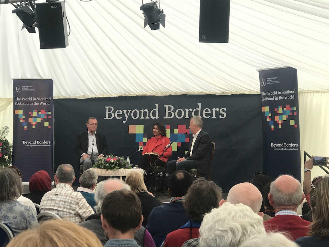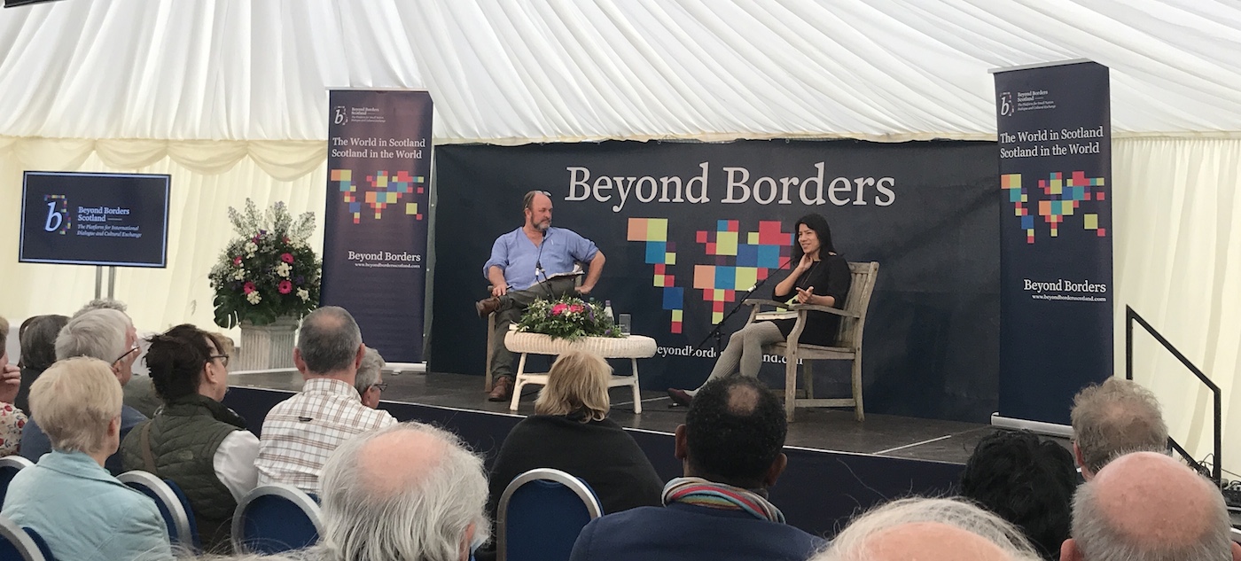 Ten o’clock on a Saturday morning. Bright sunshine outside and a sparkling programme ahead. The Beyond Borders International Festival opened with its usual sense of excitement and anticipation. Literary treats to enjoy and a tumultuous international year to be reviewed in the main tent and a side dish of live music, visual art exhibitions and spoken word events in the walled garden.