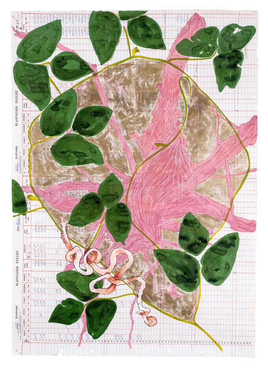 Barbadian artist Annalee Davis’s suite of drawings As If The Entanglements Of Our Lives Did Not Matter includes two family portraits that reference her mixed Caribbean heritage. Alongside the family portraits are six drawings on ledger pages, grounding these images in the history of the plantation system. Davis’s works feature plants such as Vervain, Bread and Cheese, Common Sow Thistle, Lady Palm, Paw-Paw, Sugar Cane, and Wonder-of-the-World.