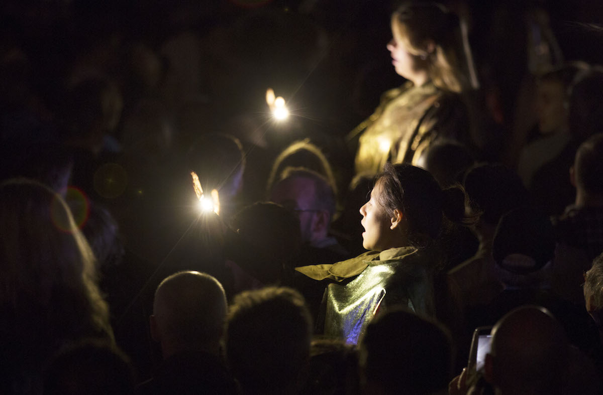 The final movement, Armistice, underlined the magnitude and weight of the conflict, an eerie stillness starts with solo cello lines which build as sound and light grow to a huge emotional climax before disappearing into a hollow resolution as the young performers processed into the light.