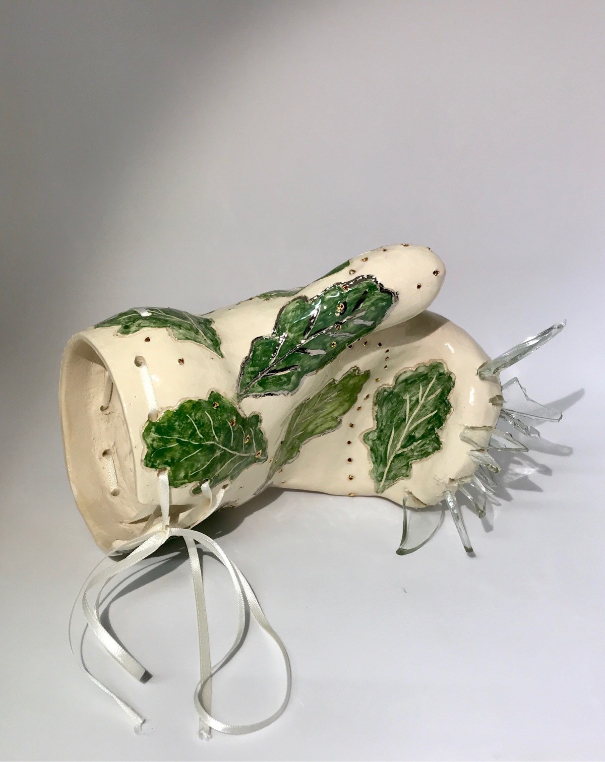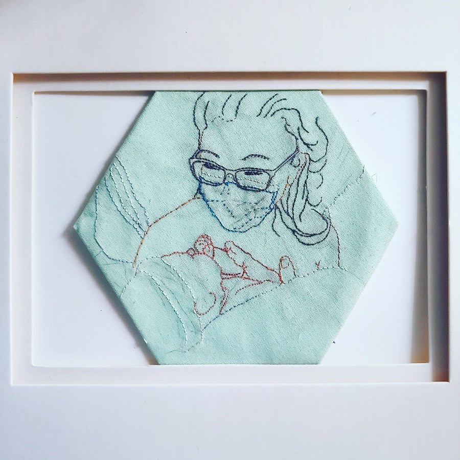 Work in the exhibition includes Lottie Bolster’s “Protection”; a hand embroidered portrait of a masked mother holding her baby for the first time, her words: “I so dearly wished to show him my face.” Michelle Gallagher’s ceramic boxing glove adorned with broken glass, the title declaring “The ceiling is breaking”, and, “WE INSIST!! IT COULD HAVE BEEN MY SON,” a collaborative video work between two American mothers Patricia Rain Gianneschi and Monika Kelsie who are part of the collective ‘Mother Art Revisited.’