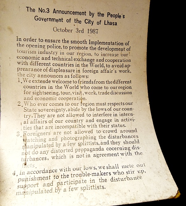 The last chapter of my memoir, 9 Months in Tibet, describes the political situation in Tibet that led to my expulsion. But there are some things which I never wrote about, one of them being the government poster that appeared all over Lhasa on the 3rd of October 1987 — offering a sort of amnesty to the rioters.