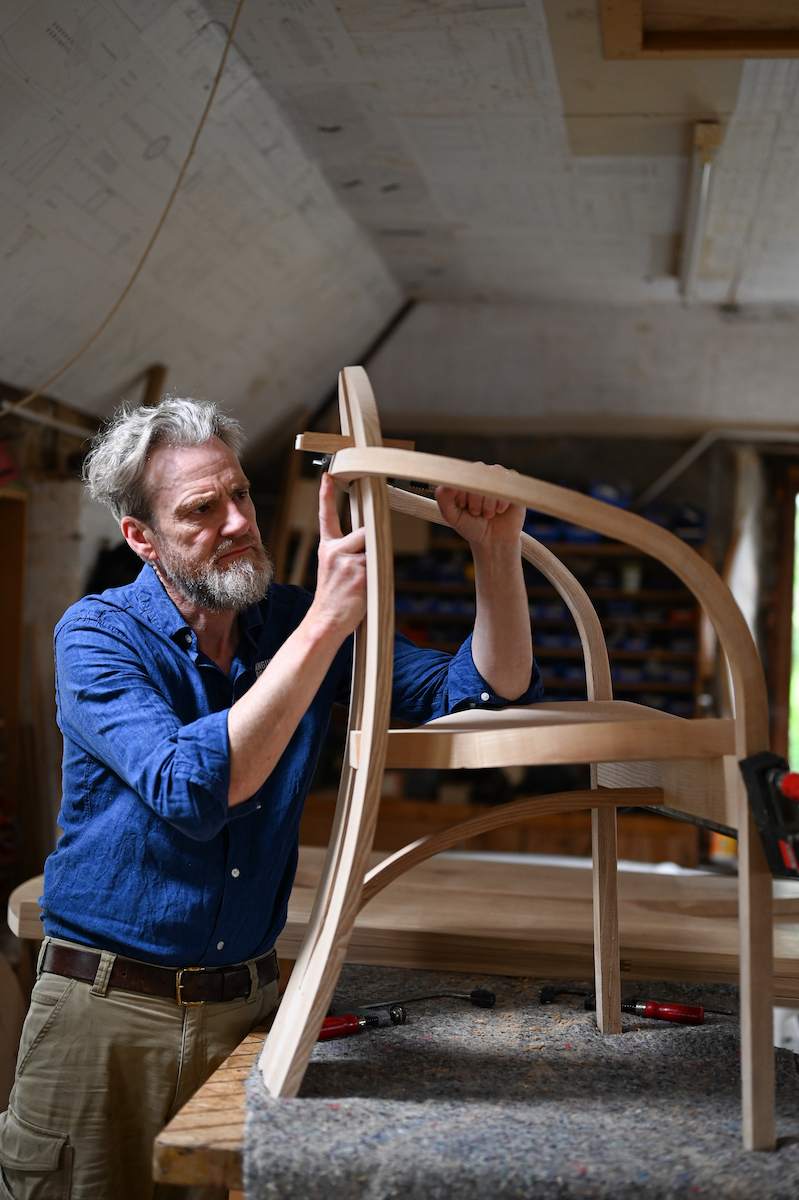 The Marchmont Workshop run by Richard Platt and Sam Cooper are based in the Borders and specialise in Rush Seated Ladderback chairs and have a wider interest in furniture inspired by the Arts and Crafts movement. For Ash Rise the duo are creating a chair and desk pairing influenced by Ernest Gimson’s Arts and Crafts designs, celebrating all wooden construction and exposed joinery.