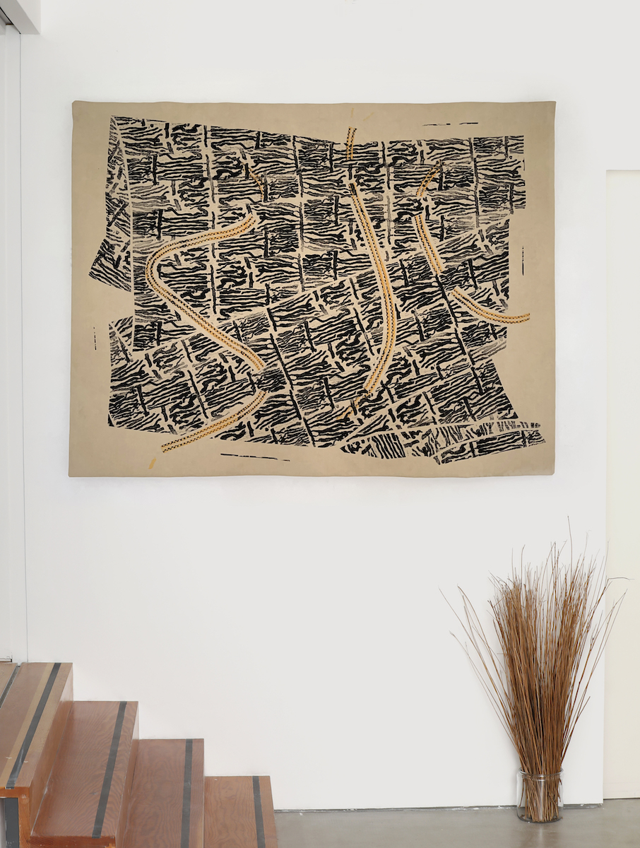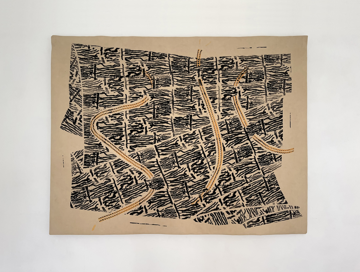 Kate Owens is an artist and designer who makes printed textiles with motifs that stagger and bump. Using an adapted block printing method, where the print block is also a wooden sandal, Kate walks motifs across the fabric using choreography and body weight to transfer ink to cloth. For Ash Rise Kate has created a naturally dyed and block printed textile hanging. The work is inspired by an early block print made by Phyllis Barron, a leading figure of the hand block printing revival in 1920’s Britain. Barron designed ‘Log’ in 1917 using the grain of a beech log intended for the fire as a repeating motif printed with natural dyes. ‘Log’ was printed in long lengths as a curtain fabric. In a similar spirit, I’ve sourced colour and pattern from the diseased tree that has been rescued from its fate as firewood by the Ash Rise project.
