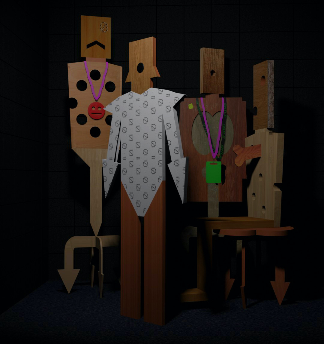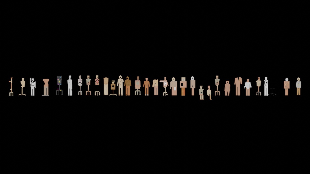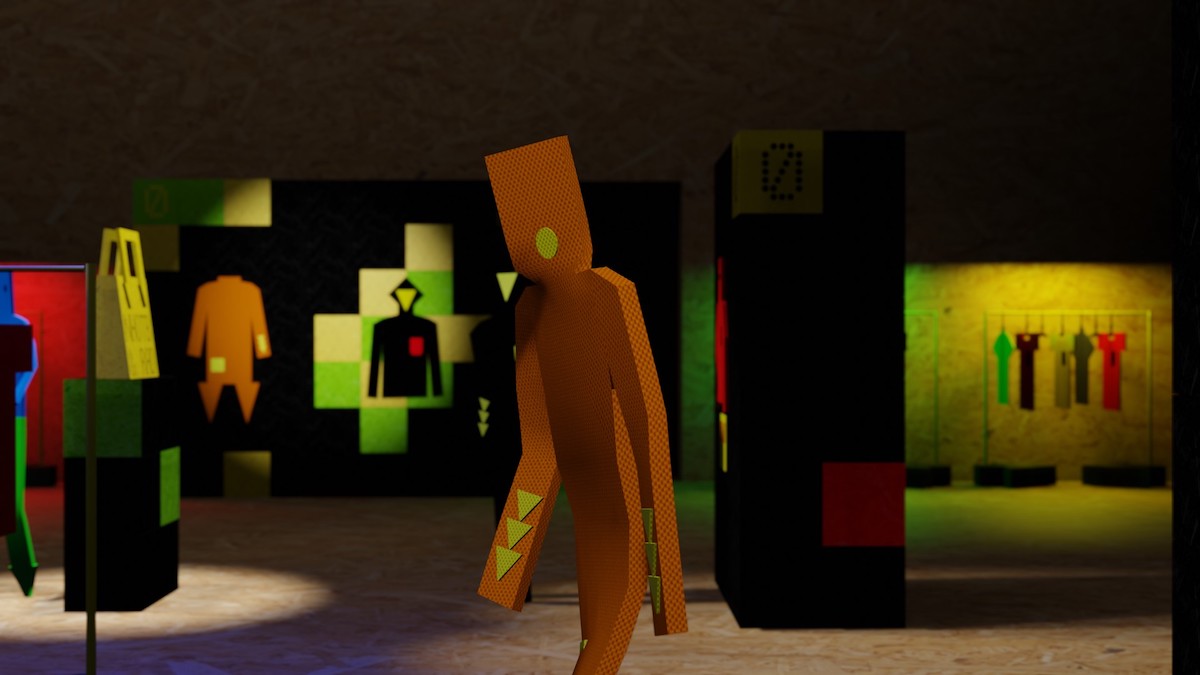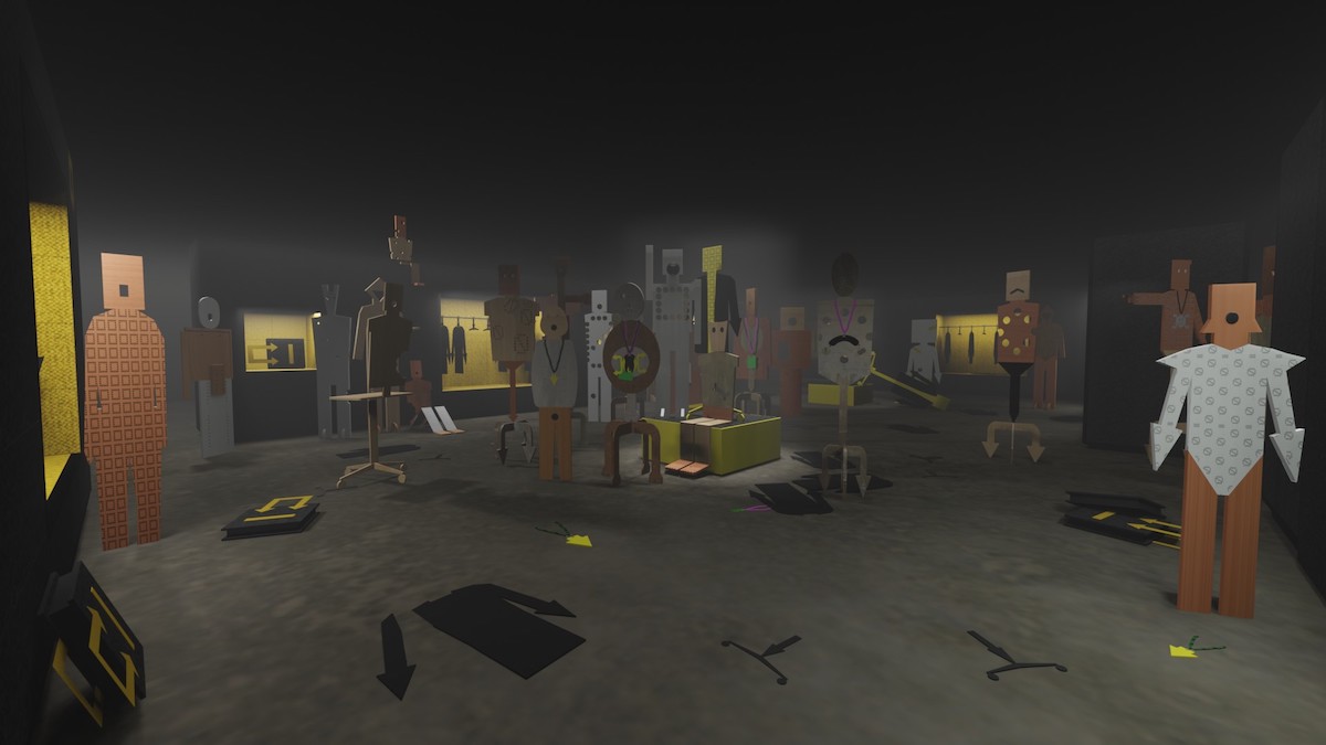 Alongside these three collections, a host of 50 life-size figures sculpted from recycled office furniture and reclaimed display materials will activate the space. Each one of these flat pack bodies is unique in its design, materiality and attitude. Many of them have become disaffected and unruly consumers. Digital avatars of these figures also star in a suite of video animations, which play out interlinked scenes alongside animated doppelgangers of the garments.