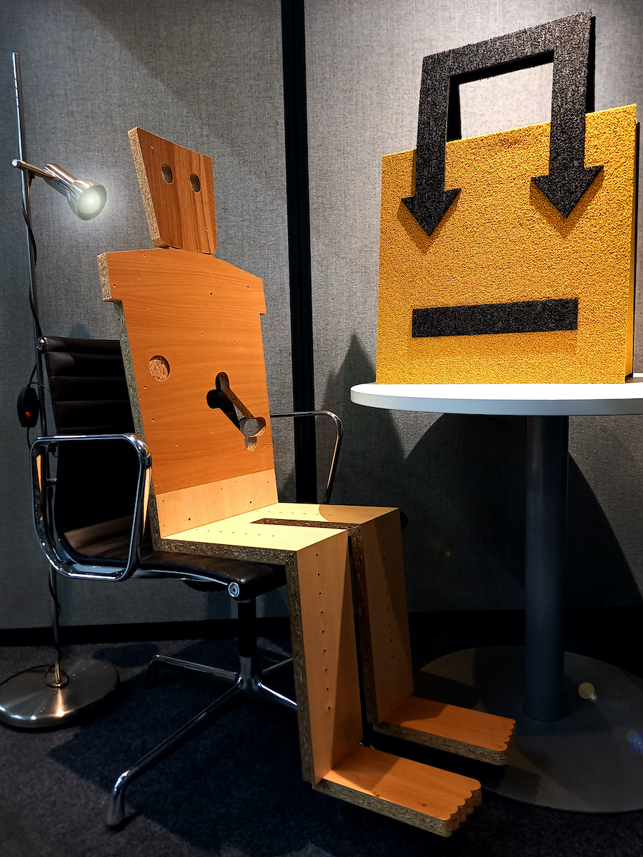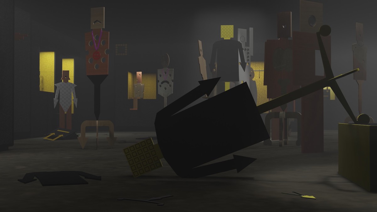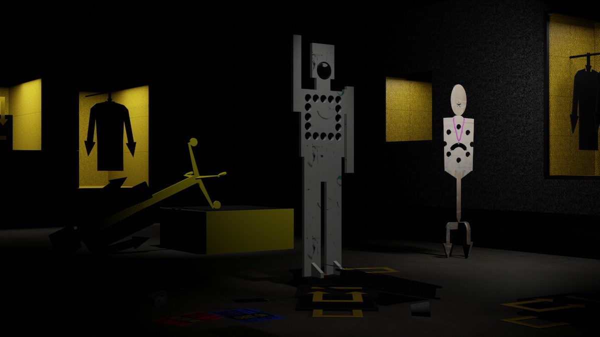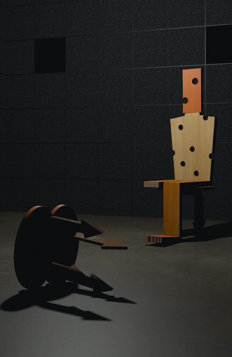 Alongside these three collections, a host of 50 life-size figures sculpted from recycled office furniture and reclaimed display materials will activate the space. Each one of these flat pack bodies is unique in its design, materiality and attitude. Many of them have become disaffected and unruly consumers. Digital avatars of these figures also star in a suite of video animations, which play out interlinked scenes alongside animated doppelgangers of the garments.