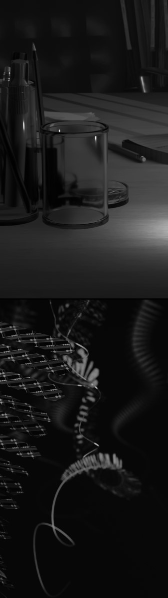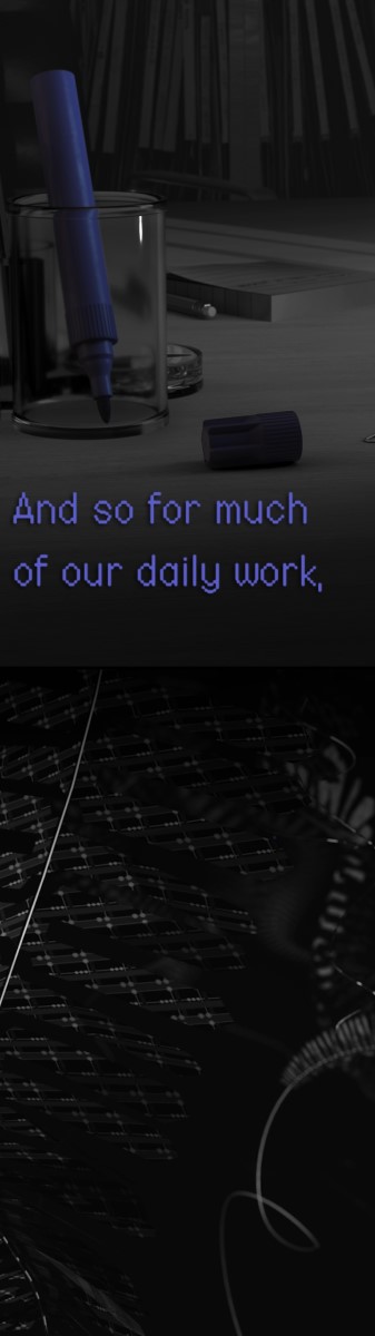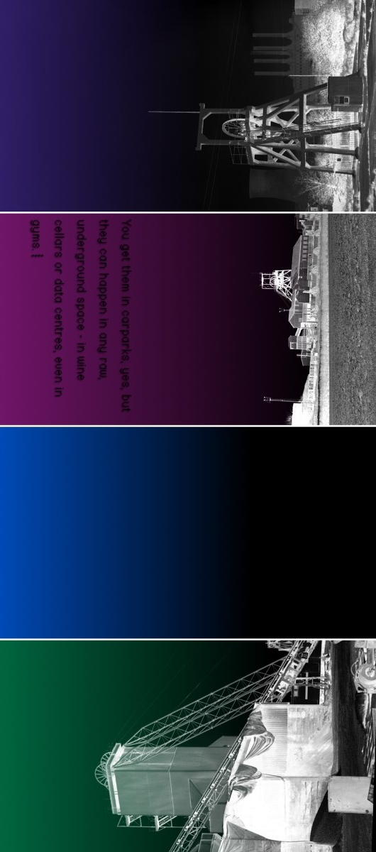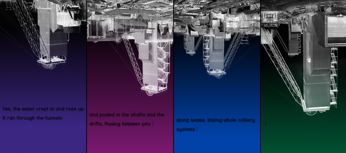 The physical layout of the installation expands on the subjects and themes of the video-cycle. The projectors are oriented vertically, standing in, at various points, for mine shafts, inkwells, the human throat, and the format of a book page. They sit at two different heights, representing spaces below and above ground, the relation between a hard drive and a desktop computer, the interconnections of our geological past and technological present, and explorations of social and economic hierarchies of labour.