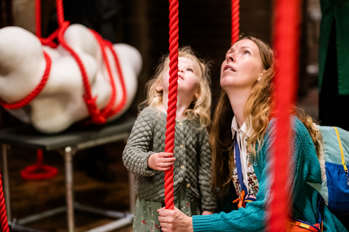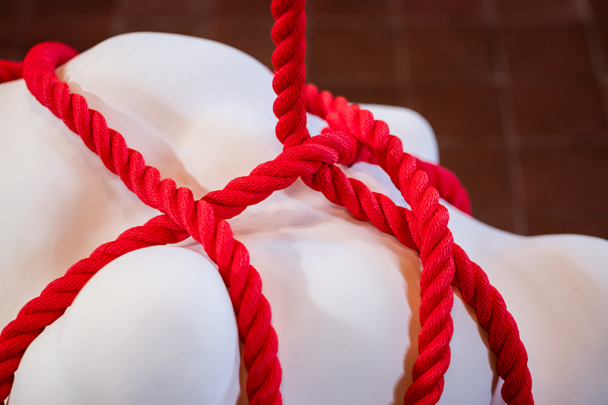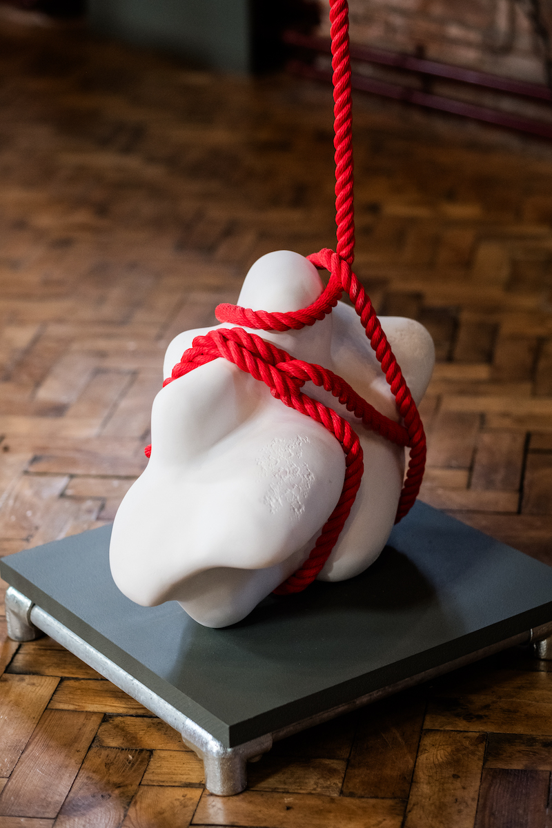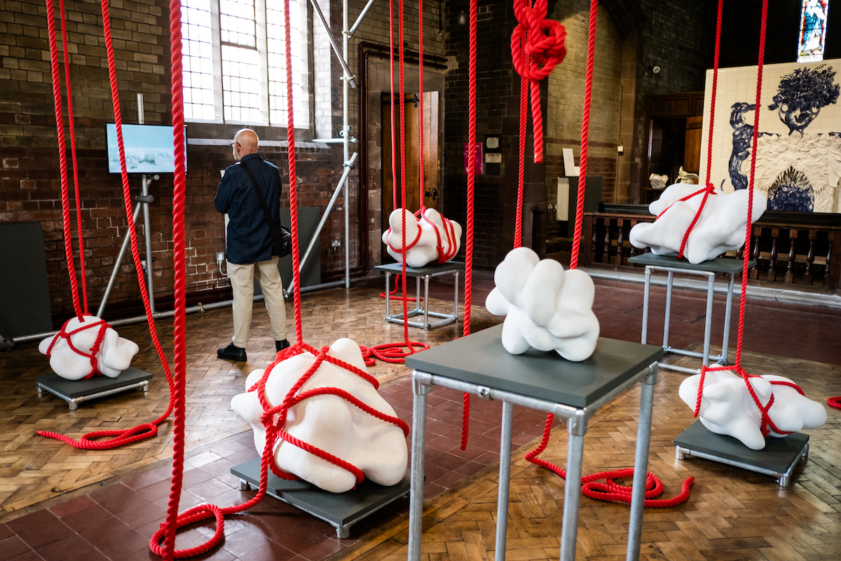 With permission from Nature Scot, Mella has made her own clay using bone-ash from the remains of a Northern bottlenose whale beached on the West Coast of Scotland. Mella has used this to make large-scale sculptural forms inspired by whales’ tiny inner-ear bones. These pieces are then wrapped in marine ropes that resonate with sonar pulse. Visitors are encouraged to touch the ropes that are wrapped around the forms, thereby feeling the vibration travel in their bodies and to reflect on the lived experience of the whales themselves. The installation is accompanied by a short film documenting a return journey taking one of the unfired sculptural forms back into the Sea in South Uist, Outer Hebrides.