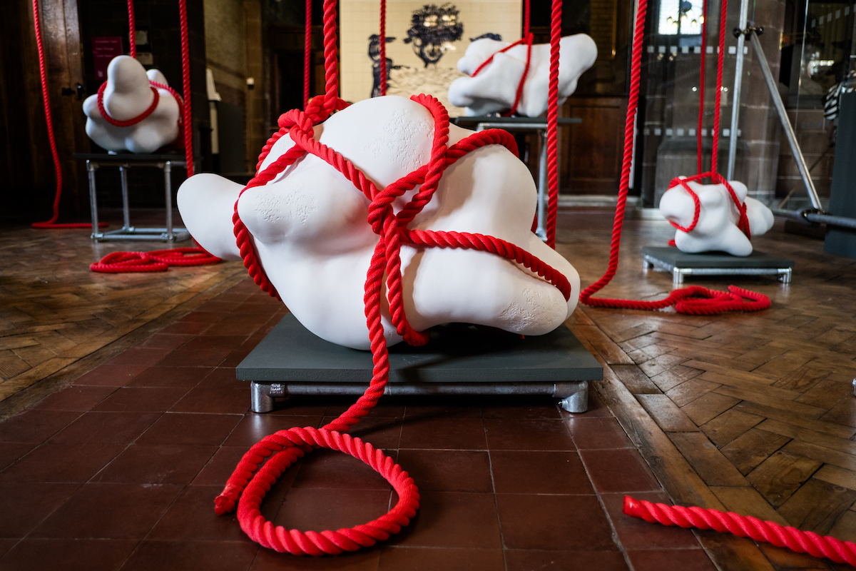 The ceramic forms are wrapped in vivid red marine ropes that vibrate with a pulse based on sonar. People who visit the exhibition will not be able to hear the sonar but instead feel it through their bodies when they touch the rope. That way they have a kind of bodily experience of what it feels like to be a whale disorientated by the sonar. The whole project is a consciousness raising exercise to draw attention to this form of pollution that very few people know about.