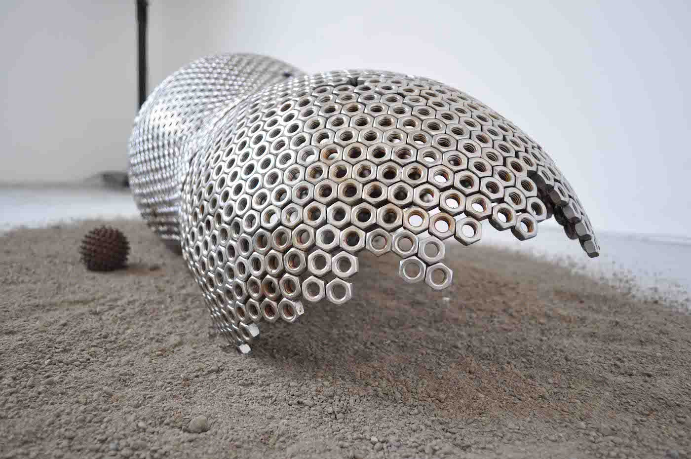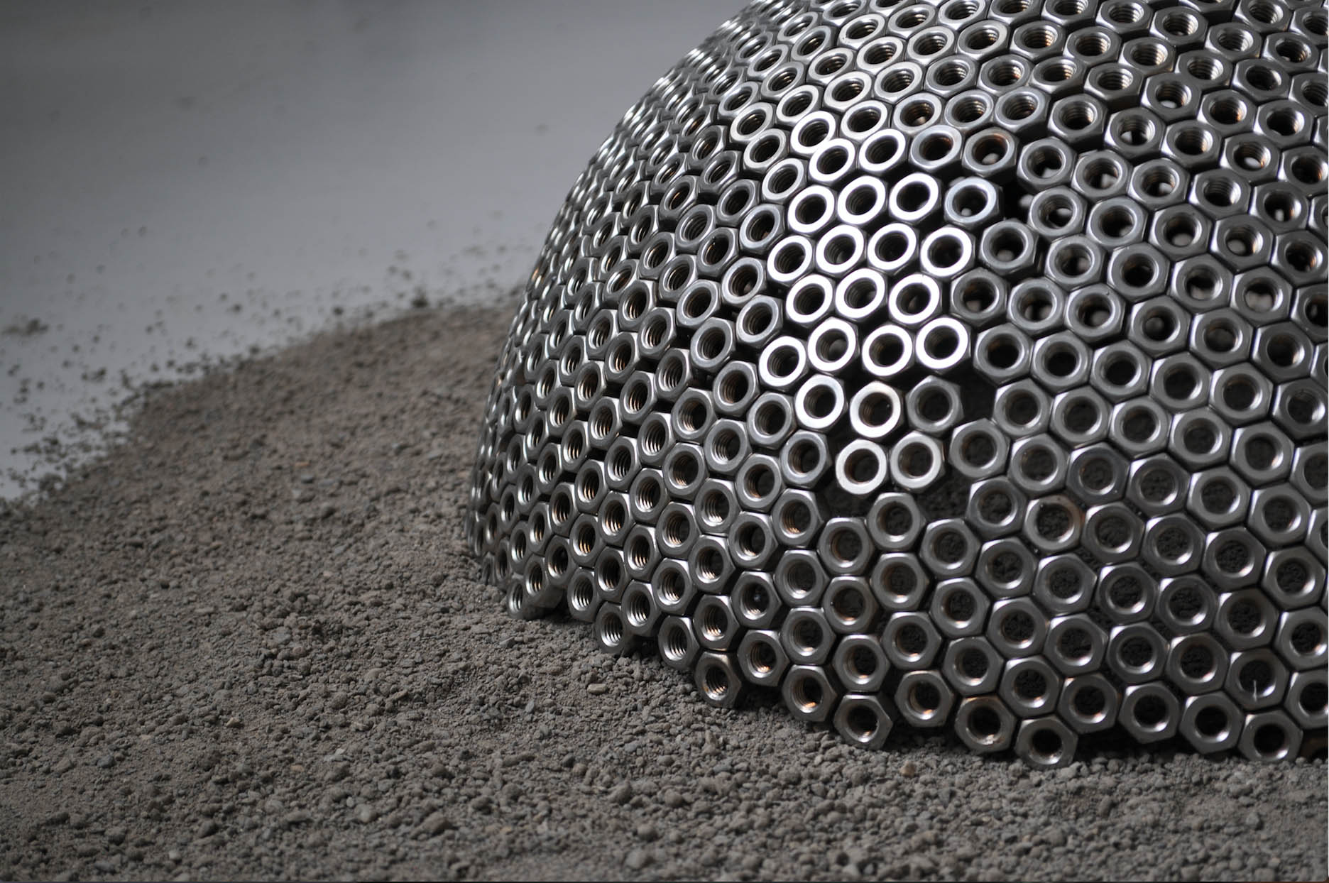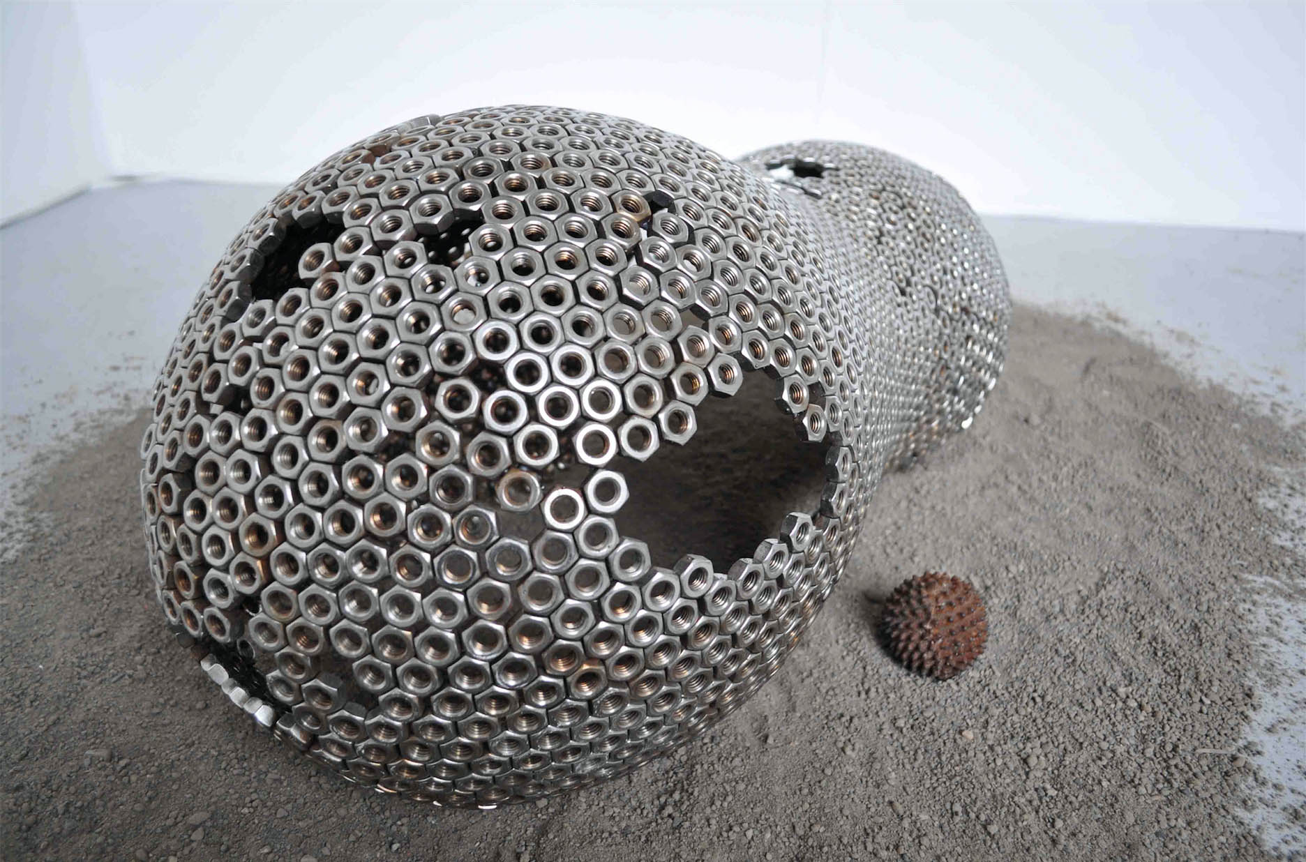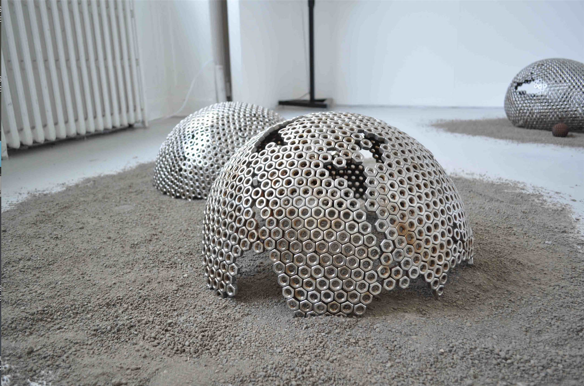 Material List; Stainless steel nuts, cast iron, cast aluminium, builder’s sand, film shown at 94cm; the height of my mother’s womb (duration 28 mins), sound; artist’s own voice.