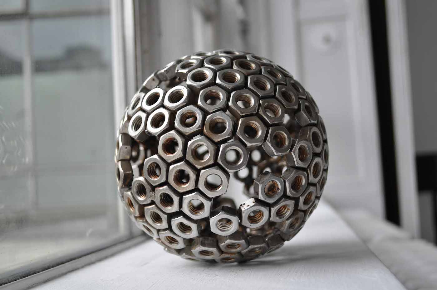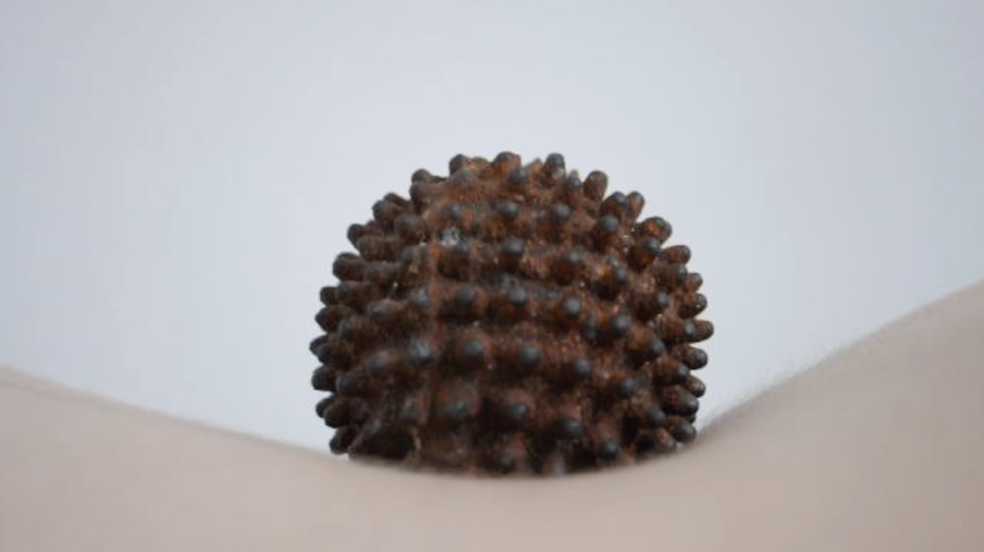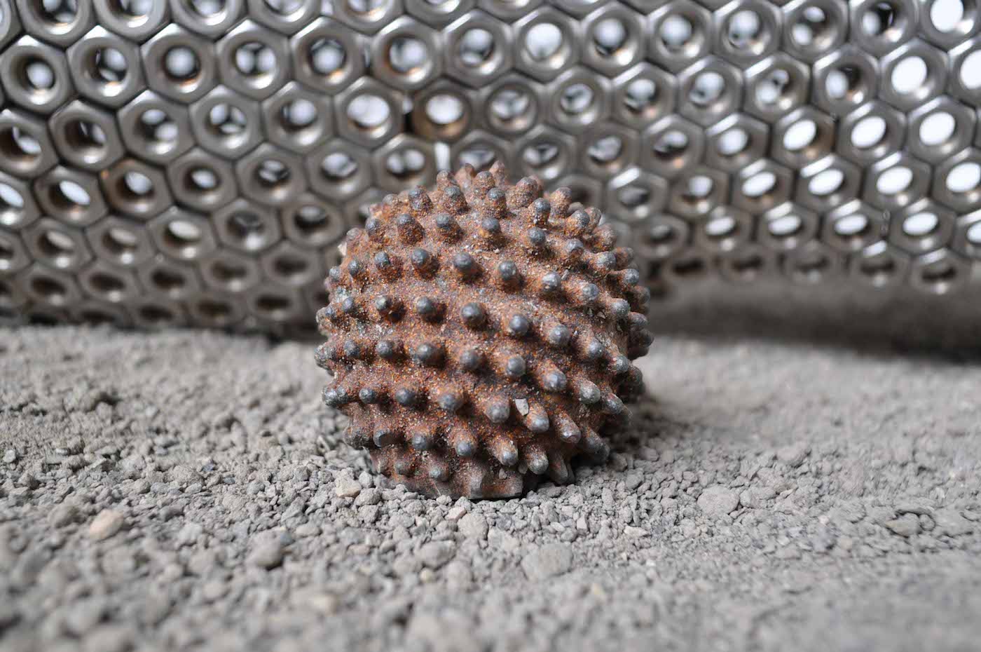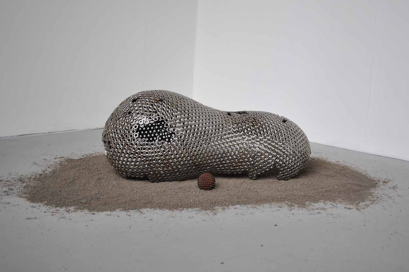 Material List; Stainless steel nuts, cast iron, cast aluminium, builder’s sand, film shown at 94cm; the height of my mother’s womb (duration 28 mins), sound; artist’s own voice.